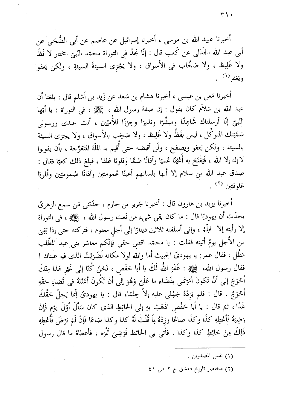 أخبرنا مَعن بن عيسى، أخبرنا هشام بن سَعد عن زَيد بن أسْلم قال: بلغنا أن عبد اللَّه بن سَلَام كان يقول: إن صفة رسول اللَّه، -صلى اللَّه عليه وسلم-، فى التوراة: يا أيّها النّبىّ إنّا أرسلناك شَاهِدًا ومبشِّرًا ونذيرًا وحِرْزًا للأُميِّين، أنت عبدى ورسولى سَمَّيْتك المتوكِّل، ليس بفَظِّ ولا غَلِيظ، ولا صَخِب بالأسواق، ولا يجزى السيئة بالسيئة، ولكن يَعفو ويصفح، ولَن أقبضه حتى أُقيم به الملّة المتَعَوِّجة، بأن يقولوا لا إله إلا اللَّه، فَيَفْتَحَ به أَعْيُنًا عُميًا وآذانًا صُمًّا وقلوبًا غلفا، فبلغ ذلك كعبًا فقال: صدق عبد اللَّه بن سلام إلا أنها بلسانهم أعينًا عُموميّين وآذانًا صُموميّين وقُلوبًا غلوفيّين (¬٢).