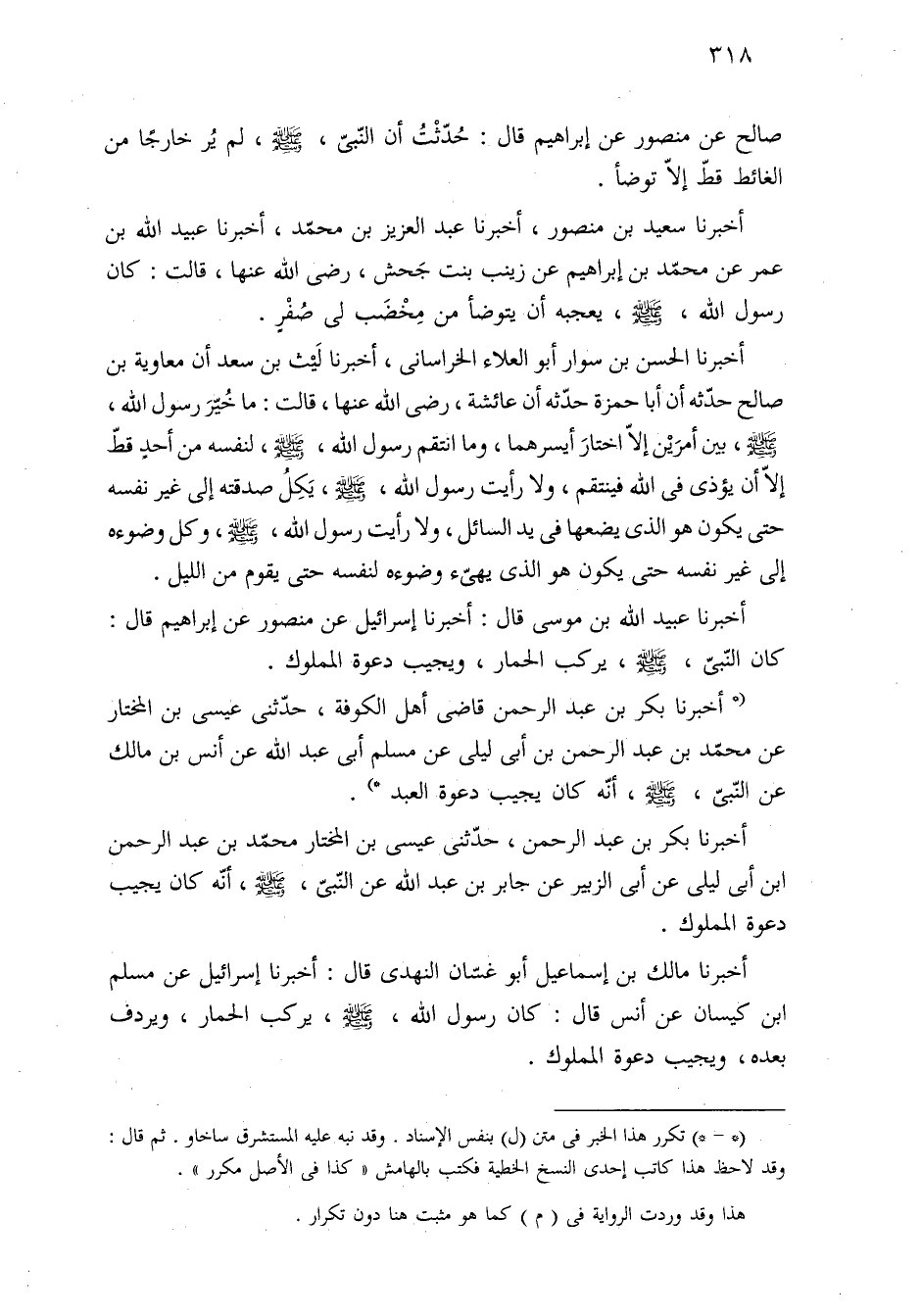 (* - *) تكرر هذا الخبر فى متن (ل) بنفس الإسناد وقد نبه عليه المستشرق ساخاو. ثم قال: وقد لاحظ هذا كاتب إحدى النسخ الخطية فكتب بالهامش "كذا فى الأصل مكرر".
