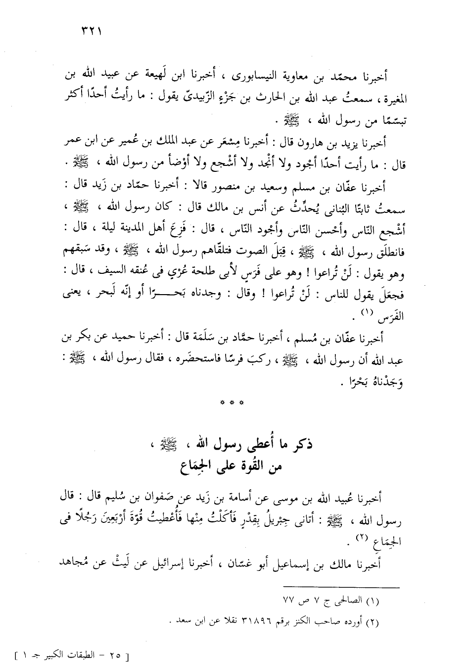 أخبرنا عفّان بن مسلم وسعيد بن منصور قالا: أخبرنا حمّاد بن زَيد قال: سمعت ثابتًا البُنانى يُحدِّثُ عن أنس بن مالك قال: كان رسول اللَّه، -صلى اللَّه عليه وسلم-، أشْجع النّاس وأحْسن النّاس وأجْود النّاس، قال: فَزِعَ أهل المدينة ليلة، قال: فانطلَق رسول اللَّه، -صلى اللَّه عليه وسلم-، قِبَلَ الصوت فتلقّاهم رسول اللَّه، -صلى اللَّه عليه وسلم-، وقد سَبقهم وهو يقول: لَنْ تُراعوا! وهو على فَرَسٍ لأبى طلحة عُرْىٍ فى عُنقه السيف، قال: فجعَلَ يقول للناس: لَنْ تُراعوا! وقال: وجدناه بَحرًا أو إنّه لَبحر، يعنى الفَرَس (¬١).