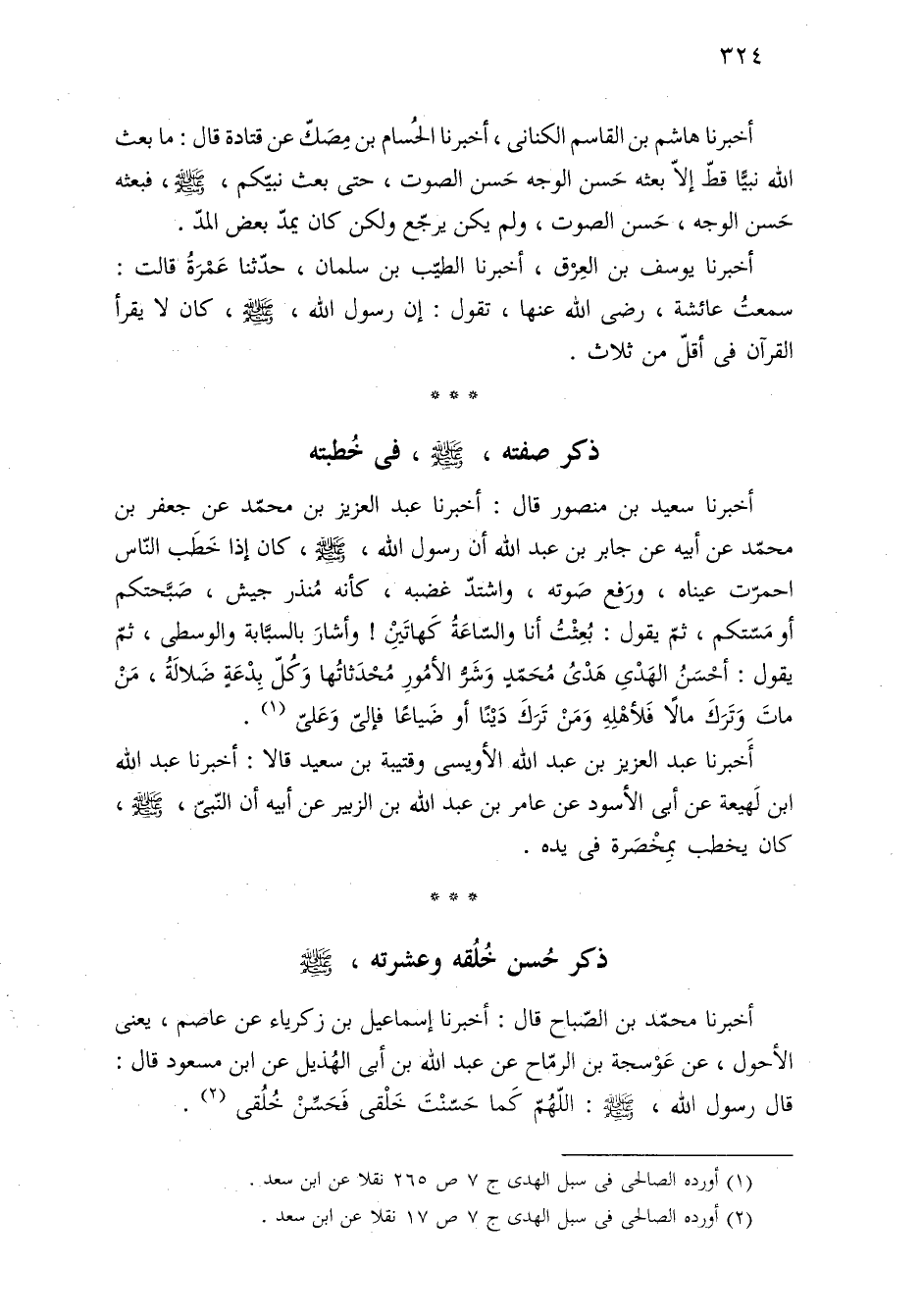 أخبرنا سعيد بن منصور قال: أخبرنا عبد العزيز بن محمّد عن جعفر بن محمّد عن أبيه عن جابر بن عبد اللَّه أن رسول اللَّه، -صلى اللَّه عليه وسلم-، كان إذا خَطَب النّاس احمرّت عيناه، ورَفع صَوته، واشتدّ غضبه، كأنه مُنذر جيش، صَبَّحتكم أو مَسّتكم، ثمّ يقول: بُعِثْتُ أنا والسّاعَةُ كَهاتَيِنْ! وأشارَ بالسبَّابة والوسطى، ثمّ يقول: أحْسَنُ الهَدْىِ هَدْىُ مُحَمّدٍ وَشَرُّ الأمُورِ مُحْدَثاتُها وَكُلّ بِدْعَةٍ ضَلالَةُ، مَن ماتَ وَتَرَكَ مالًا فَلأهْلِهِ وَمَنْ تَرَكَ دَيْنًا أو ضَياغًا فإلىّ وَعَلىّ (¬١).