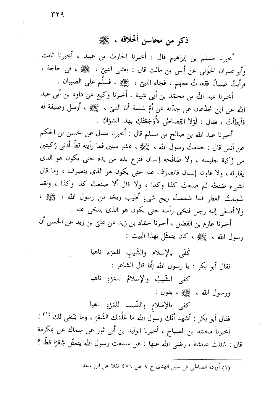 أخبرنا محمّد بن الصباح، أخبرنا الوليد بن أبى ثور عن سِماك عن عِكرمة قال: سُئلتْ عائشة، رضى اللَّه عنها: هل سمعت رسول اللَّه يتمثّل شِعْرًا قطّ؟