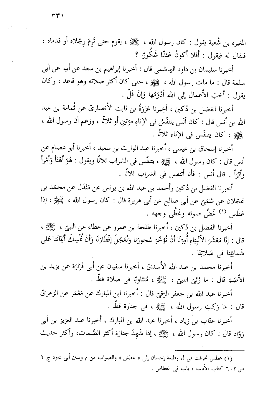 أخبرنا الفضل بن دُكين، أخبرنا عَزْرَةُ بن ثابت الأنصارىّ عن ثُمامة بن عبد اللَّه بن أنس قال: كان أنَس يتنفّسُ فى الإناءِ مرّتينِ أو ثلاثًا، وزعم أن رسول اللَّه، -صلى اللَّه عليه وسلم-، كان يتنفّس فى الإناء ثلاثًا.
