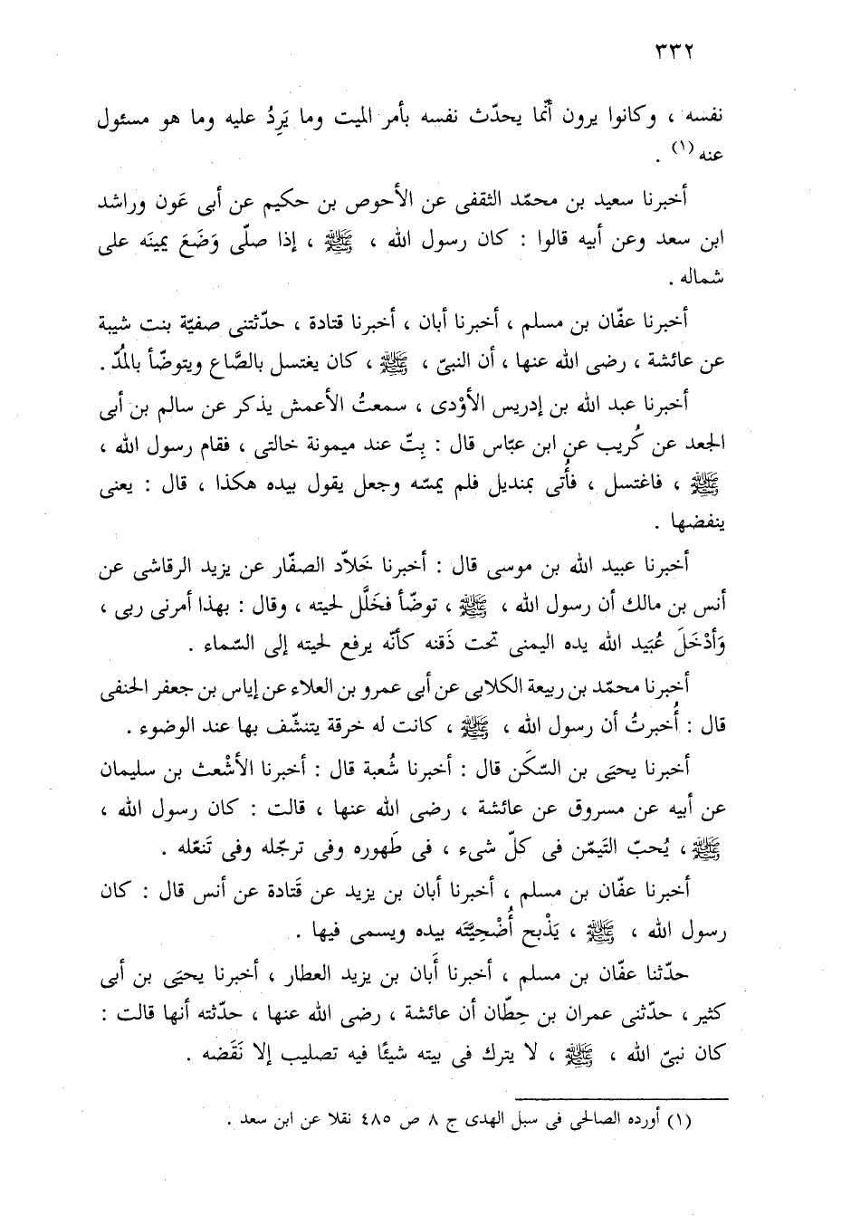 أخبرنا عفّان بن مسلم، أخبرنا أبان، أخبرنا قتادة، حدّثتنى صفيّة بنت شيبة عن عائشة، رضى اللَّه عنها، أن النبىّ، -صلى اللَّه عليه وسلم-، كان يغتسل بالصَّاع ويتوضّأ بالمُدّ.
