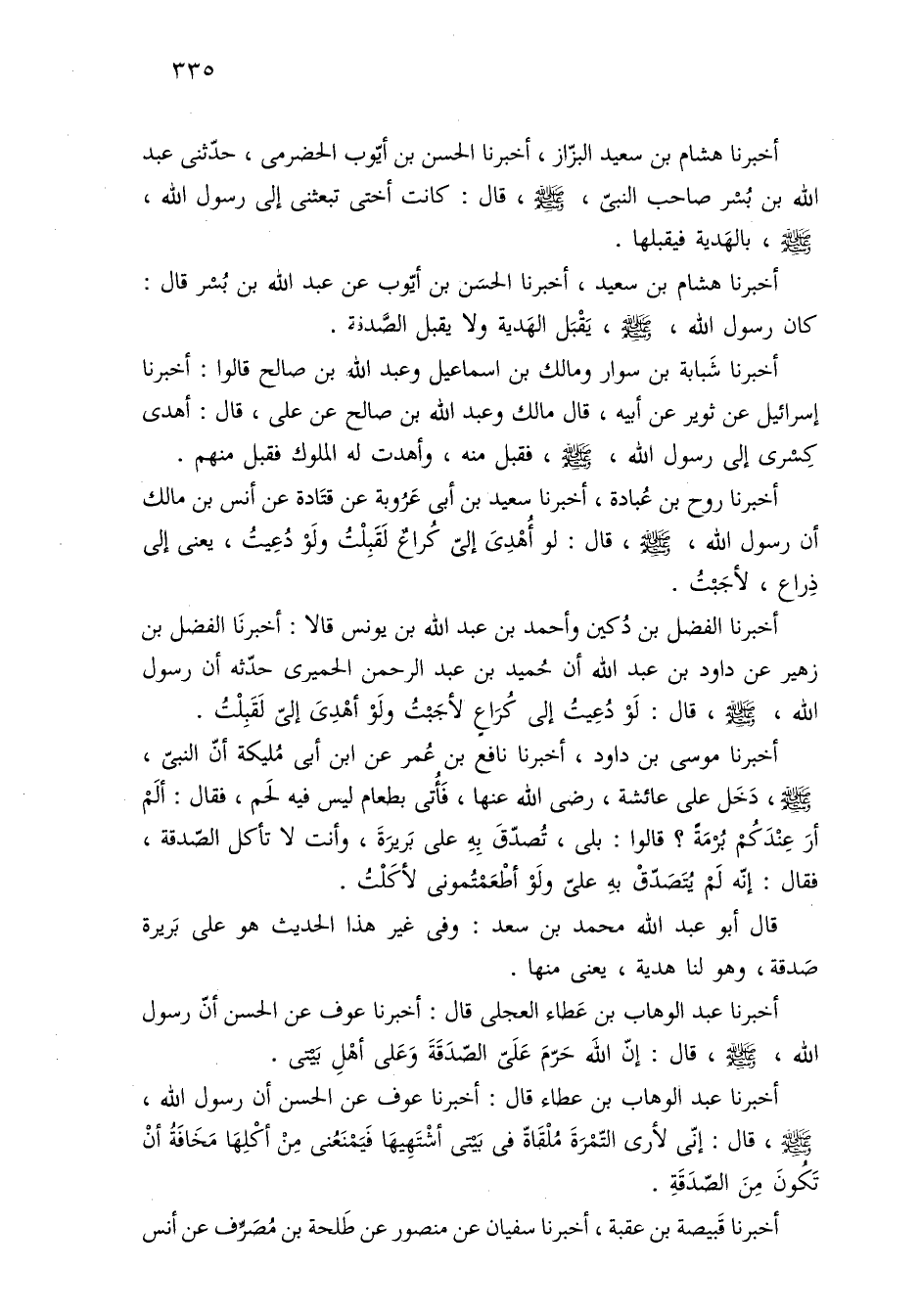 أخبرنا عبد الوهاب بن عَطاء العجلى قال: أخبرنا عوف عن الحسن أنّ رسول اللَّه، -صلى اللَّه عليه وسلم-، قال: إنّ اللَّه حَرّمَ عَلَىّ الصّدَقَةَ وَعَلى أهْلِ بَيْتى.