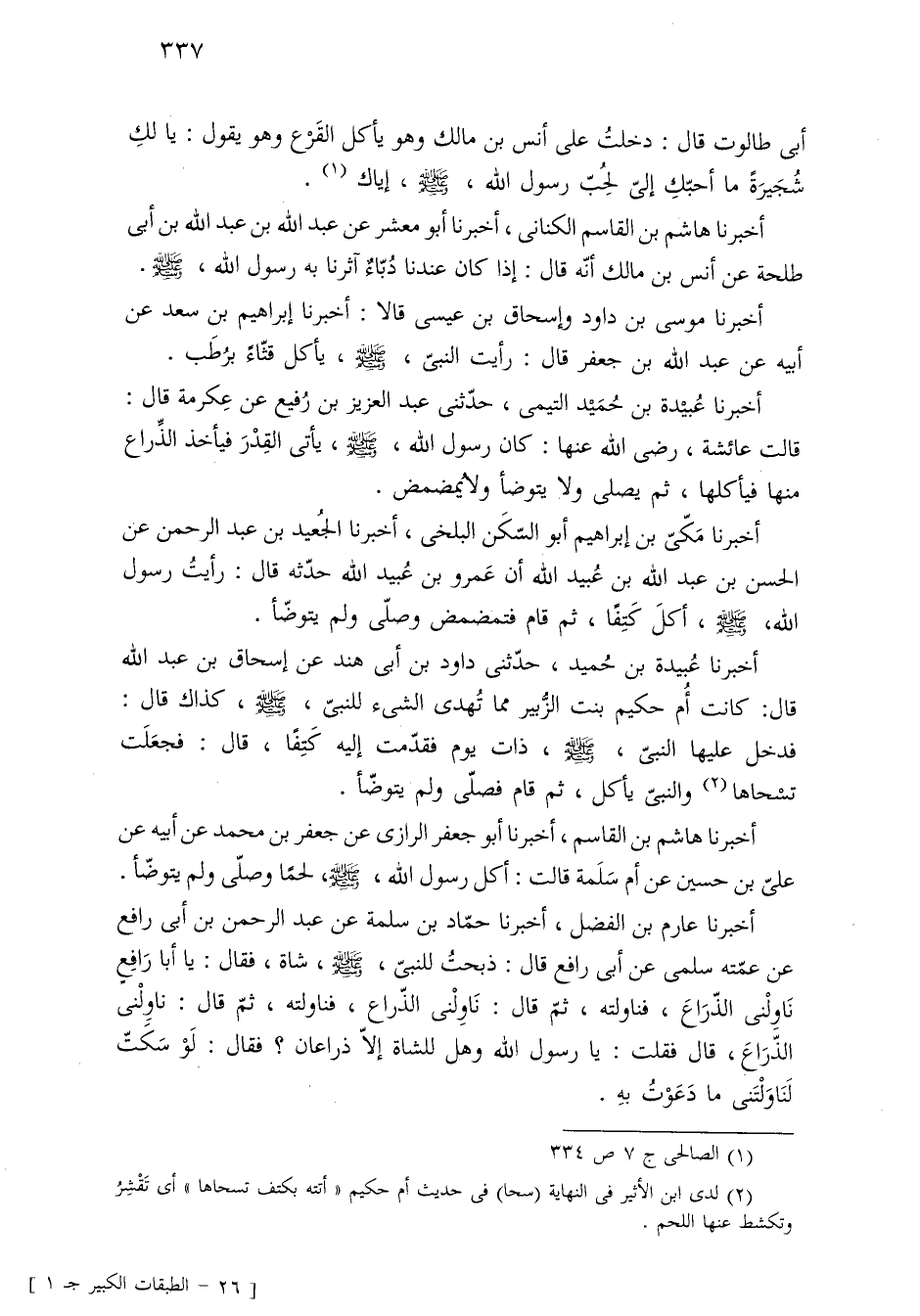 أخبرنا هاشم بن القاسم، أخبرنا أبو جعفر الرازى عن جعفر بن محمد عن أبيه عن علىّ بن حسين عن أم سَلَمة قالت: أكل رسول اللَّه، -صلى اللَّه عليه وسلم-، لحمًا وصلّى ولم يتوضّأ.