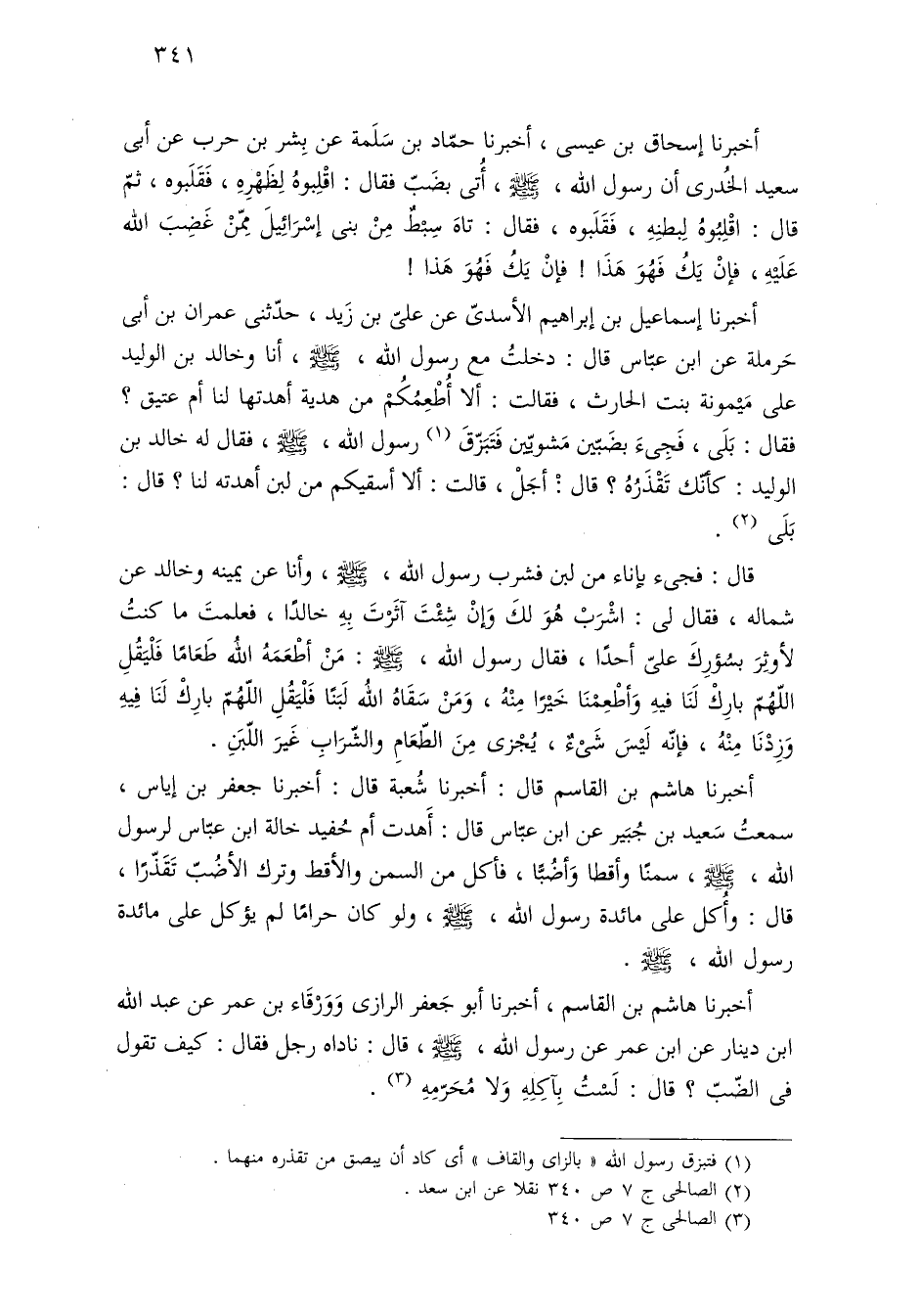 أخبرنا هاشم بن القاسم قال: أخبرنا شُعبة قال: أخبرنا جعفر بن إياس، سمعتُ سَعيد بن جُبَير عن ابن عبّاس قال: أَهدت أم حُفيد خالة ابن عبّاس لرسول اللَّه، -صلى اللَّه عليه وسلم-، سمنًا وأقطًا وَأضُبًّا، فأكل من السمن والأقط وترك الأضُبّ تَقَذّرًا، قال: وأُكل على مائدة رسول اللَّه، -صلى اللَّه عليه وسلم-، ولو كان حرامًا لم يؤكل على مائدة رسول اللَّه، -صلى اللَّه عليه وسلم-.