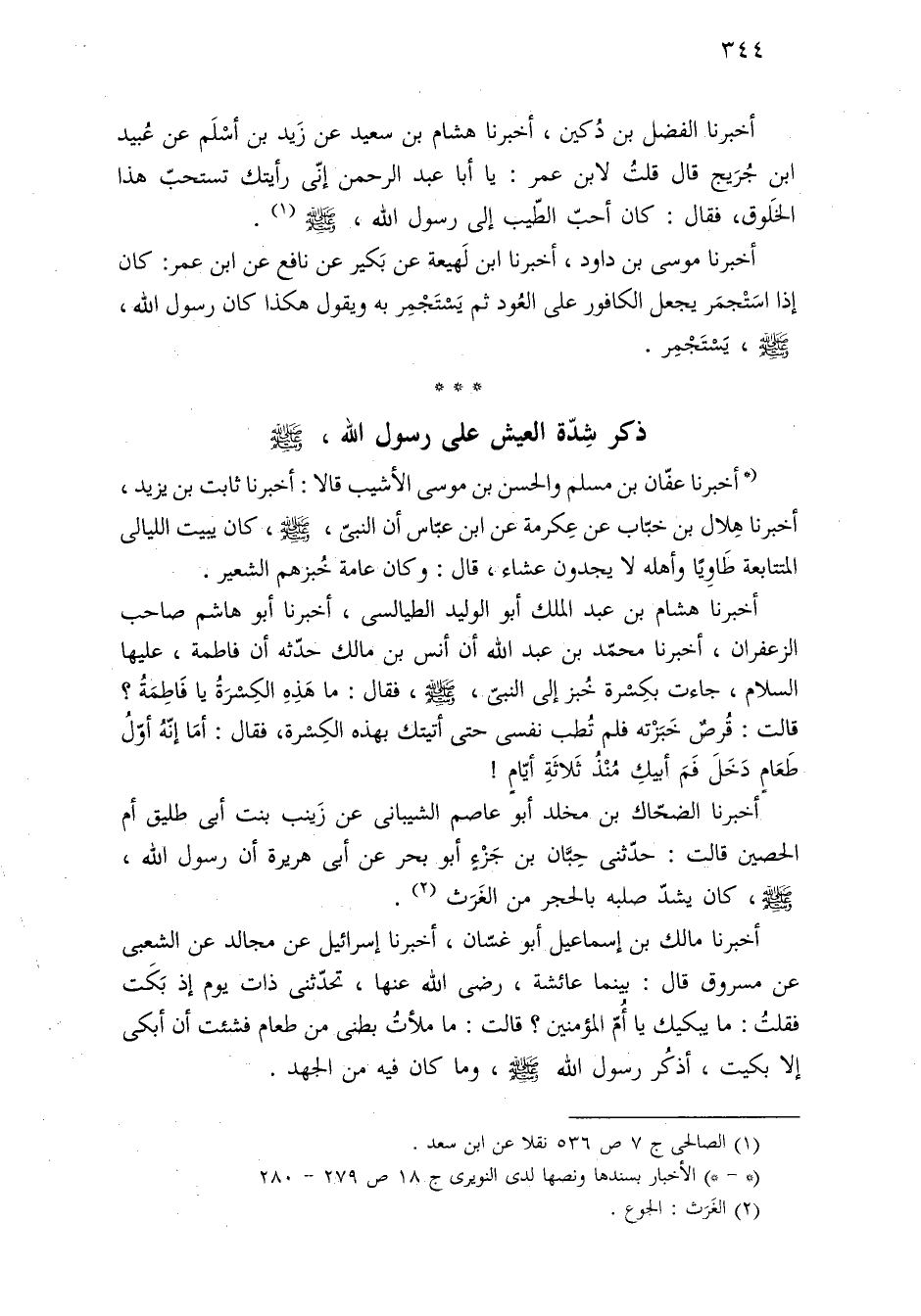 أخبرنا الضحّاك بن مخلد أبو عاصم الشيبانى عن زَينب بنت أبى طليق أم الحصين قالت: حدّثنى حِبَّان بن جَزْءٍ أبو بحر عن أبى هريرة أن رسول اللَّه، -صلى اللَّه عليه وسلم-، كان يشدّ صلبه بالحجر من الغَرَث (¬٢).
