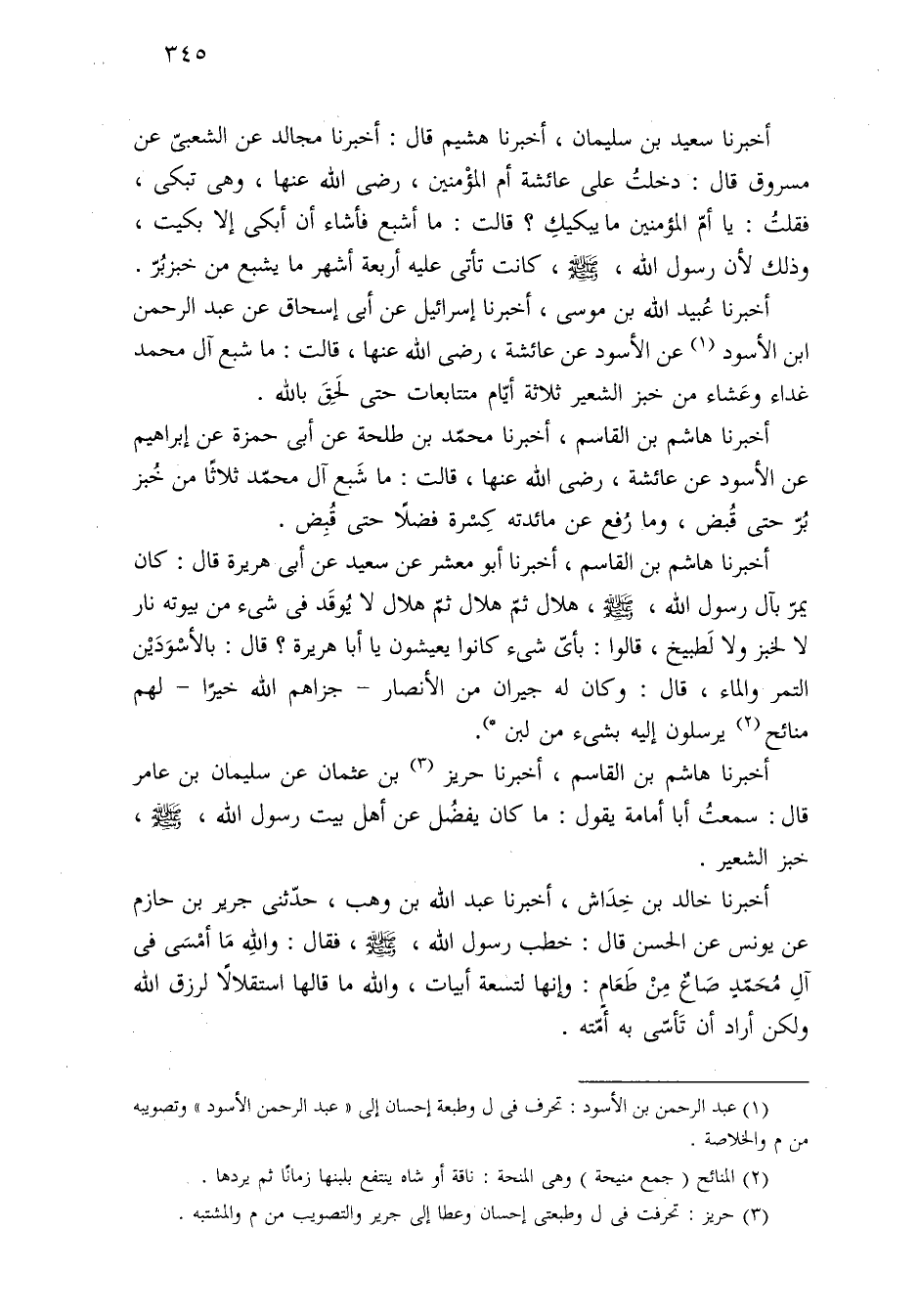 أخبرنا سعيد بن سليمان، أخبرنا هشيم قال: أخبرنا مجالد عن الشعبىّ عن مسروق قال: دخلتُ على عائشة أم المؤْمنين، رضى اللَّه عنها، وهى تبكى، فقلتُ: يا أمّ المؤمنين ما يبكيكِ؟ قالت: ما أشبع فأشاء أن أبكى إلا بكيت، وذلك لأن رسول اللَّه، -صلى اللَّه عليه وسلم-، كانت تأتى عليه أربعة أشهر ما يشبع من خبز بُرّ.