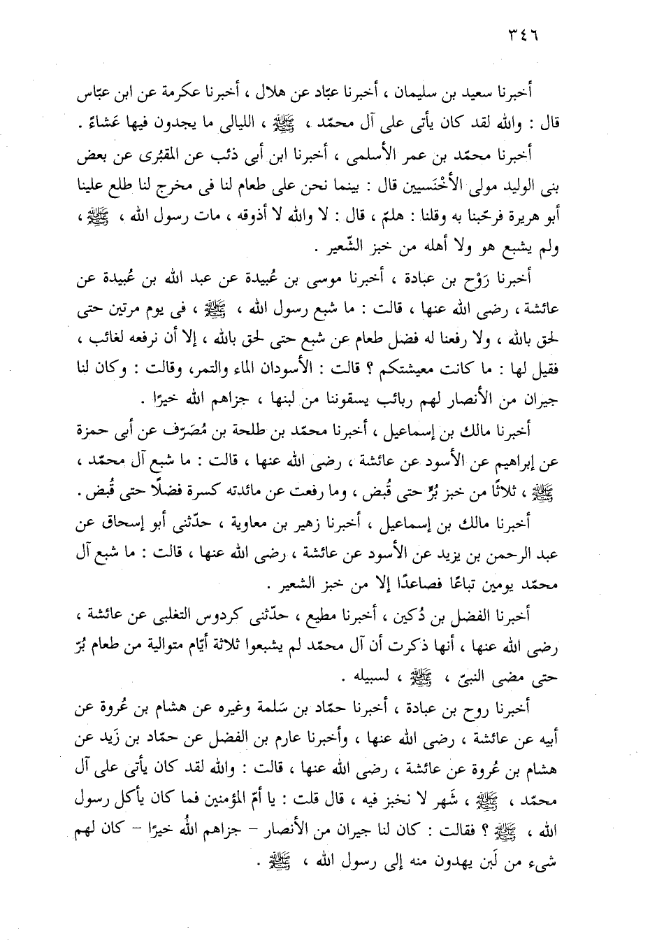 أخبرنا روح بن عبادة، أخبرنا حمّاد بن سَلمة وغيره عن هشام بن عُروة عن أبيه عن عائشة، رضى اللَّه عنها، وأخبرنا عارم بن الفضل عن حمّاد بن زَيد عن هشام بن عُروة عن عائشة، رضى اللَّه عنها، قالت: واللَّه لقد كان يأتى على آل محمّد، -صلى اللَّه عليه وسلم-، شَهر لا نخبز فيه، قال قلت: يا أمّ المؤمنين فما كان يأكل رسول اللَّه، -صلى اللَّه عليه وسلم-؟ فقالت: كان لنا جيران من الأنصار -جزاهم اللَّه خيرًا- كان لهم شئ من لَبن يهدون منه إلىّ رسول اللَّه، -صلى اللَّه عليه وسلم-.