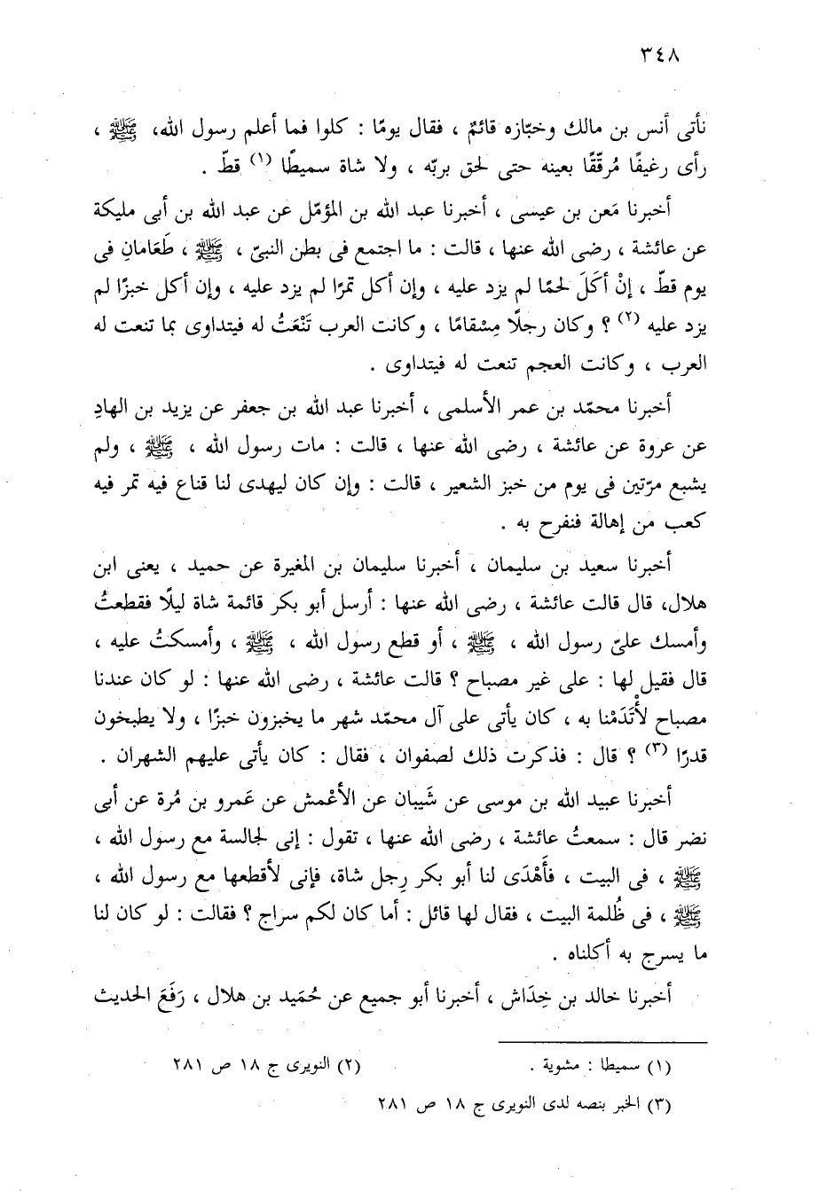 أخبرنا سعيد بن سليمان، أخبرنا سليمان بن المغيرة عن حميد، يعنى ابن هلال، قال قالت عائشة، رضى اللَّه عنها: أرسل أبو بكر قائمة شاة ليلًا فقطعتُ وأمسك علىّ رسول اللَّه، -صلى اللَّه عليه وسلم-، أو قطع رسول اللَّه، -صلى اللَّه عليه وسلم-، وأمسكتُ عليه، قال فقيل لها: على غير مصباح؟ قالت عائشة، رضى اللَّه عنها: لو كان عندنا مصباح لأْتَدَمْنا به، كان يأتى على آل محمّد شهر ما يخبزون خبزًا، ولا يطبخون قدرًا (¬٣)؟ قال: فذكرت ذلك لصفوان، فقال: كان يأتى عليهم الشهران.