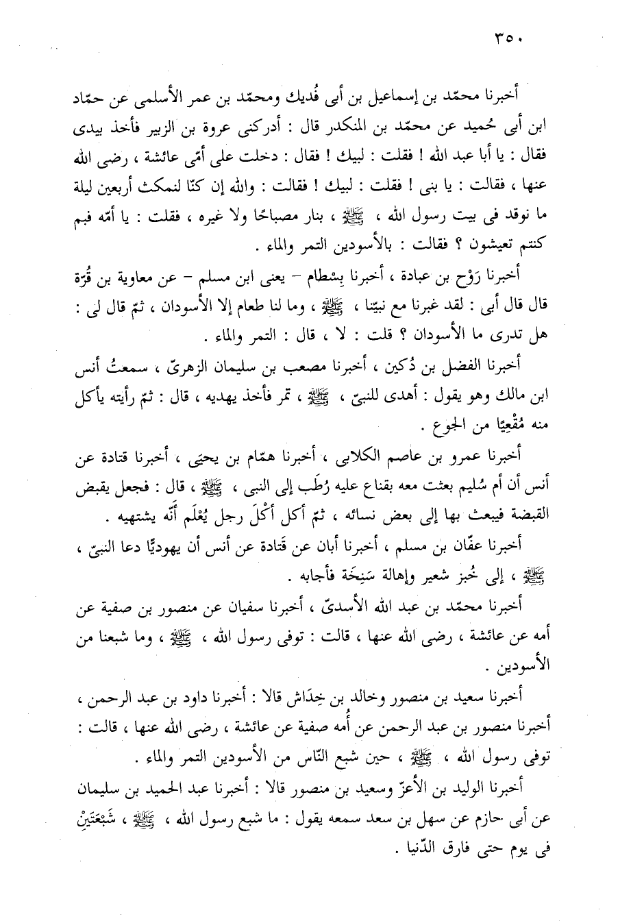 أخبرنا سعيد بن منصور وخالد بن خِدَاش قالا: أخبرنا داود بن عبد الرحمن، أخبرنا منصور بن عبد الرحمن عن أُمه صفية عن عائشة، رضى اللَّه عنها، قالت: توفى رسول اللَّه، -صلى اللَّه عليه وسلم-، حين شبع النّاس من الأسودين التمر والماء.