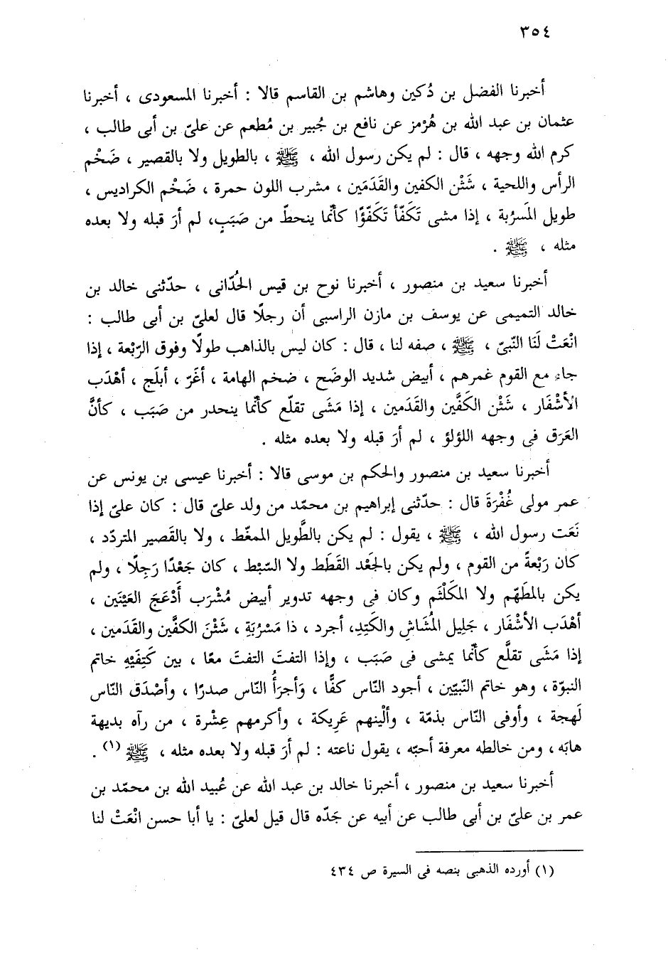أخبرنا سعيد بن منصور، أخبرنا نوح بن قيس الحُدّانى، حدّثنى خالد بن خالد التميمى عن يوسف بن مازن الراسبى أنَّ رجلًا قال لعلىّ بن أبى طالب: نْعَتْ لَنَا النّبىّ، -صلى اللَّه عليه وسلم-، صفه لنا، قال: كان ليس بالذاهب طولًا وفوق الرّبْعة، إذا جاء مع القوم غمرهم، أبيض شديد الوضَح، ضخم الهامة، أغَرّ، أبلَج، أهْدَب الأشْفَار، شَثْن الكَفَين والقَدَمين، إذا مَشَى تقلّع كأنّما ينحدر من صَبَب، كأنَّ العَرَق فى وجهه اللؤلؤ، لم أرَ قبله ولا بعده مثله.