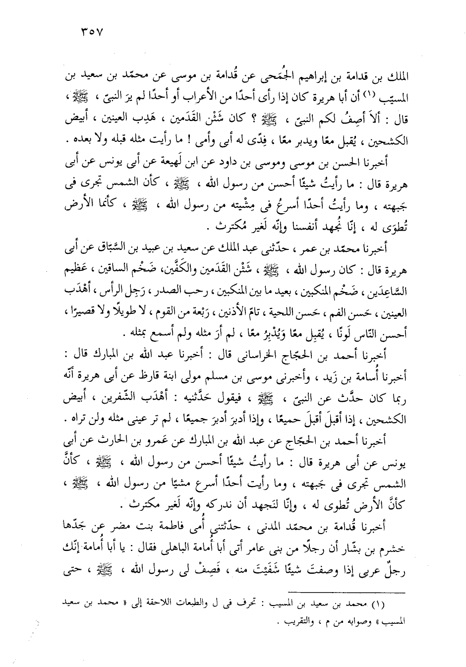 الملك بن قدامة بن إبراهيم الجُمَحى عن قُدامة بن موسى عن محمّد بن سعيد بن المسيّب (¬١) أنَّ أبا هريرة كان إذا رأى أحدًا من الأعراب أو أحدًا لم يرَ النبىّ، -صلى اللَّه عليه وسلم-، قال: ألَا أصِفُ لكم النبىّ، -صلى اللَّه عليه وسلم-؟ كان شَثْن القَدَمين، هَدِب العينين، أبيض الكشحين، يُقبل معًا ويدبر معًا، فِدًى له أبى وأمى! ما رأيت مثله قبله ولا بعده.
