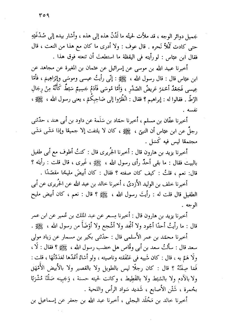 جَميل دوائر الوجه، قد ملأت لحيتُه ما لَدُنْ هذه إلى هذه، وأشار بيده إلى صُدْغَيْهِ حتى كادت تَمْلأ نَحره. قال عوف: ولا أدرى ما كان مع هذا من النعت، قال فقال ابن عبّاس: لو رأيته فى اليقظة ما استطعتَ أن تنعته فوق هذا.