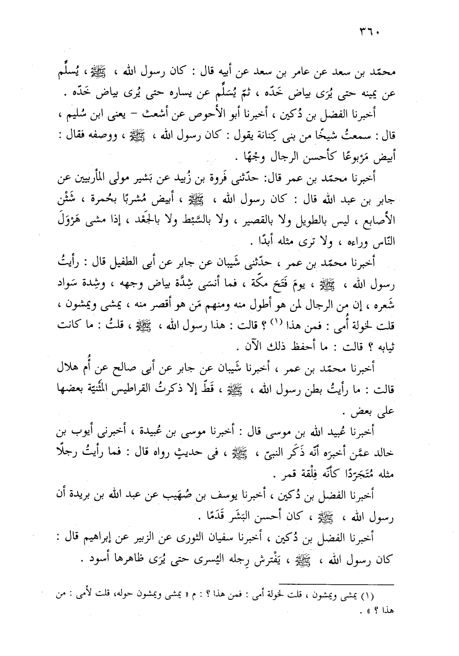 أخبرنا محمّد بن عمر قال: حدّثنى فَروة بن زُبيد عن بَشير مولى المأربيين عن جابر بن عبد اللَّه قال: كان رسول اللَّه، -صلى اللَّه عليه وسلم-، أبيض مُشربًا بحُمرة، شَثْن الأصابع، ليس بالطويل ولا بالقصير، ولا بالسَّبْط ولا بالجَعْد، إذا مشى هَرْوَلَ النّاس وراءه، ولا ترى مثله أبدًا.
