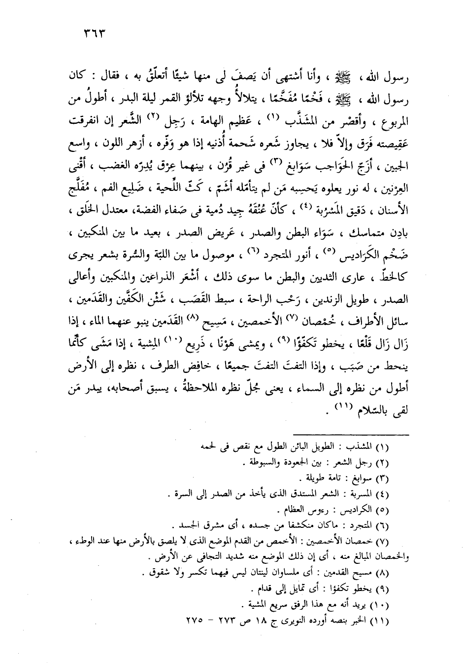 رسول اللَّه، -صلى اللَّه عليه وسلم-، وأنا أشتهى أن يَصفَ لى منها شيئًا أتعلَّقُ به، فقال: كان رسول اللَّه، -صلى اللَّه عليه وسلم-، فَخْمًا مُفَخَّمًا، يتلالأُ وجهه تلألؤ القمر ليلة البدر، أطولُ من المربوع، وأقصْر من المشَذَّب (¬١)، عَظيم الهامة، رَجِل (¬٢) الشَّعر إن انفرقت عَقِيصته فَرَق وإلّا فلا، يجاوز شَعره شَحمة أُذنيه إذا هو وَفّره، أزهر اللون، واسع الجبين، أزَجّ الحَوَاجب سَوَابغ (¬٣) فى غير قُرُن، بينهما عِرْق يُدِرّه الغضب، أقْنى العِرْنين، له نور يعلوه يَحسِبه مَن لم يتأمّله أشَمّ، كَثّ اللِّحية، ضَلِيع الفم، مُفَلَّج الأسنان، دَقيق المَسْرُبة (¬٤)، كأنّ عُنُقَهُ جِيد دُمية فى صَفاء الفضة، معتدل الخَلق، بادِن متماسك، سَوَاء البطن والصدر، عَريض الصدر، بعيد ما بين المنكبين، ضَخْم الكَرَاديس (¬٥)، أنور المتجرد (¬٦)، موصول ما بين اللبّه والسُّرة بشعر يجرى كالخطّ، عارى الثديين والبطن ما سوى ذلك، أشْعَر الذراعين والمنكبين وأعالى الصدر، طويل الزندين، رَحْب الراحة، سبط القَصَب، شَثْن الكَفَّين والقَدَمين، سائل الأطراف، خُمْصان (¬٧) الأخمصين، مَسِيح (¬٨) القَدَمين ينبو عنهما الماء، إذا زَال زَال قَلْعًا، يخصو تَكفّؤًا (¬٩)، ويمشى هَوْنًا، ذَرِيع (¬١٠) المِشية، إذا مَشَى كأنّما ينحط من صَبَب، وإذا التفتَ التفتَ جميعًا، خافِض الطرف، نظره إلى الأرض أطول من نظره إلى السماء، يعنى جُلّ نظره الملاحظةُ، يسبق أصحابه، يبدر مَن لقى بالسّلام (¬١١).