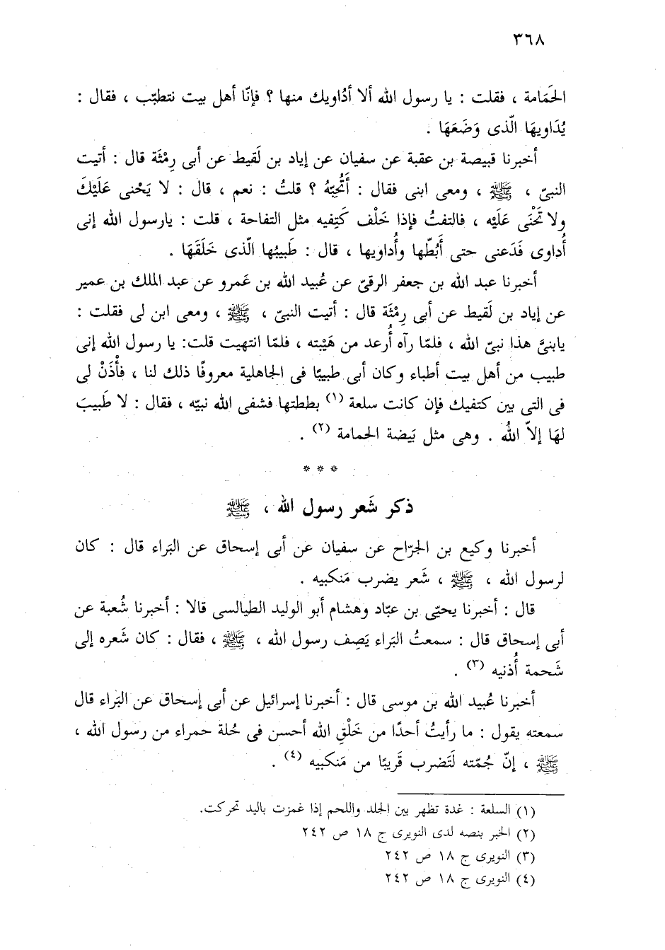 أخبرنا عبد اللَّه بن جعفر الرقىّ عن عُبيد اللَّه بن عَمرو عن عبد الملك بن عمير عن إياد بن لَقيط عن أبى رِمْثة قال: أتيت النبىّ، -صلى اللَّه عليه وسلم-، ومعى ابن لى فقلت: يا بنىَّ هذا نبىّ اللَّه، فلمّا رآه أُرعد من هَيْبته، فلمّا انتهيت قلت: يا رسول اللَّه إنى طبيب من أهل بيت أطباء وكان أبى طبيبًا فى الجاهلية معروفًا ذلك لنا، فأْذَنْ لى فى التى بين كتفيك فإن كانت سلعة (¬١) بططتها فشفى اللَّه نبيّه، فقال: لا طَبيبَ لهَا إلّا اللَّهُ. وهى مثل بَيضة الحمامة (¬٢).
