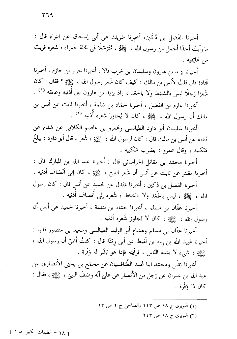 أخبرنا الفَضل بن دُكَين، أخبرنا شريك عن أبى إسحاق عن البَراء قال: ما رأيتُ أحدًا أجمل من رسول اللَّه، -صلى اللَّه عليه وسلم-، مُتَرَجّلًا فَى حُلة حمراء، شَعره قريبٌ من عَاتِقيه.