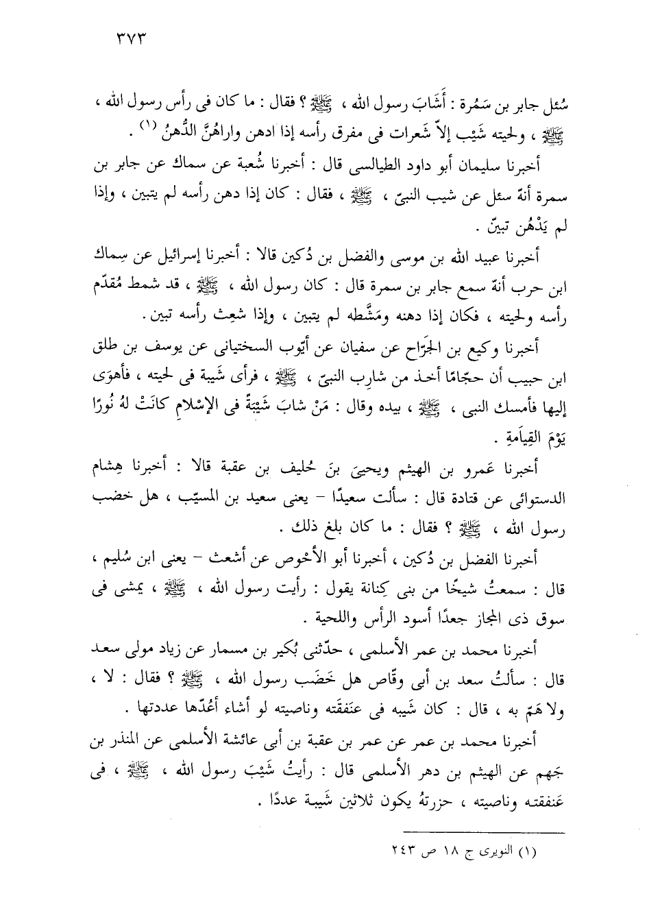 أخبرنا وكيع بن الجَرّاح عن سفيان عن أيّوب السختيانى عن يوسف بن طلق ابن حبيب أن حجّامًا أخذ من شارِب النبىّ، -صلى اللَّه عليه وسلم-، فرأى شَيبة فى لحيته، فأهوَى إليها فأمسك النبىّ، -صلى اللَّه عليه وسلم-، بيده وقال: مَنْ شابَ شَيْبَةً فى الإسْلامِ كانَتْ لهُ نُورًا يَوْمَ القِيَامةِ.