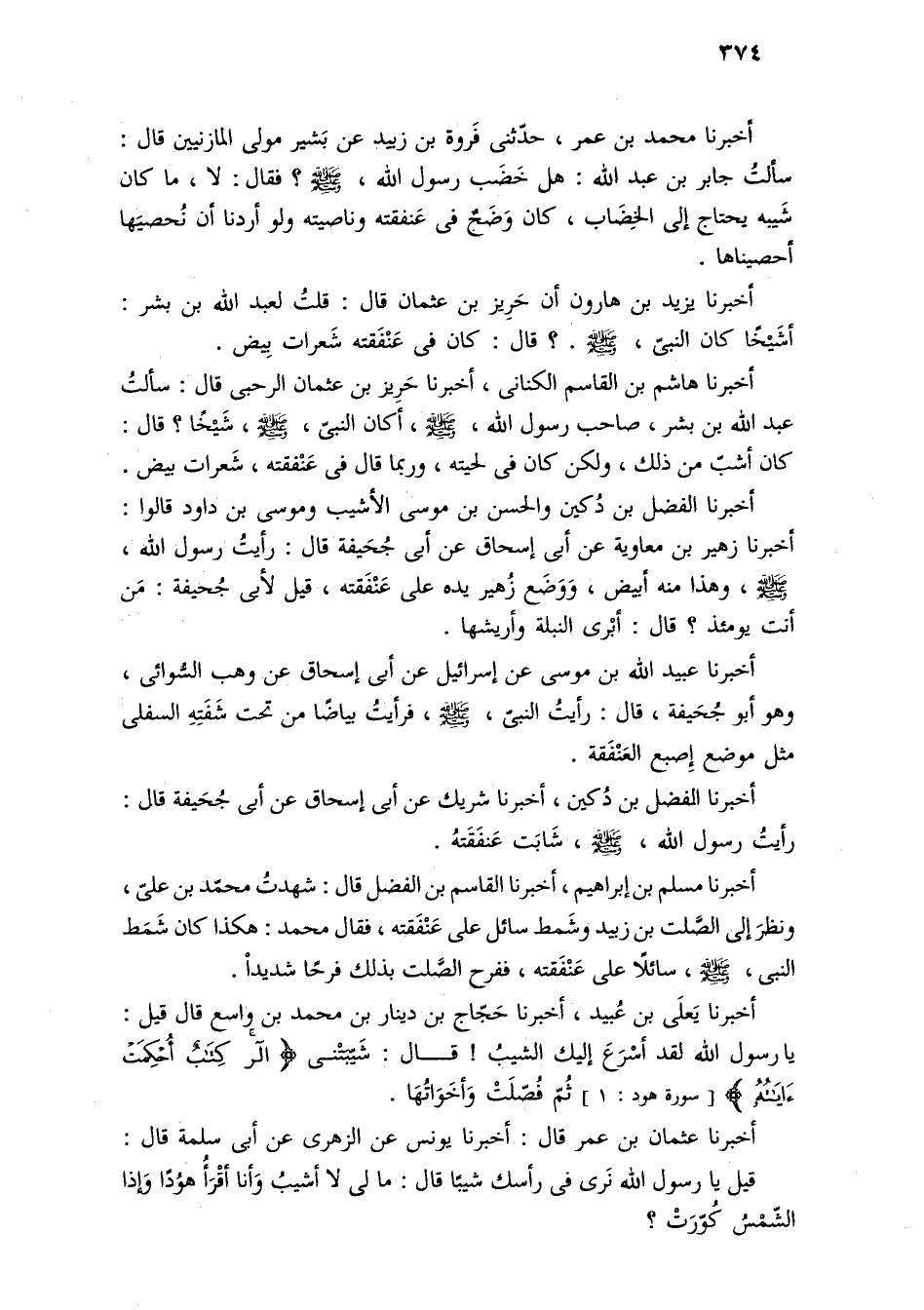 أخبرنا الفضل بن دُكين والحسن بن موسى الأشيب وموسى بن داود قالوا: أخبرنا زهير بن معاوية عن أبى إسحاق عن أبى جُحَيفة قال: رأيتُ رسول اللَّه، -صلى اللَّه عليه وسلم-، وهذا منه أبيض، وَوَضَع زُهير يده على عَنْفَقته، قيل لأبى جُحيفة: مَن أنت يومئذ؟ قال: أبْرى النبلة وأريشها.