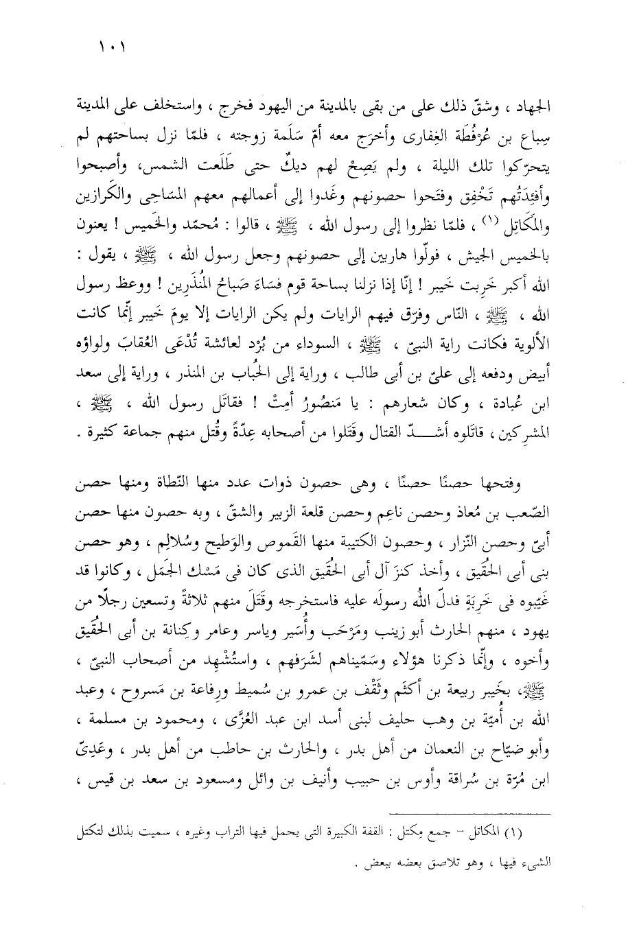 وفتحها حصنًا حصنًا، وهى حصون ذوات عدد منها النّطاة ومنها حصن الصّعب بن مُعاذ وحصن ناعِم وحصن قلعة الزبير والشقّ، وبه حصون منها حصن أبىّ وحصن النّزار، وححهمون الكتيبة منها القَموص والوَطيح وسُلالِم، وهو حصن بنى أبى الحُقَيق، وأخذ كنزَ آل أبى الحُقَيق الذى كان فى مَسْك الجَمَل، وكانوا قد غَيّبوه فى خَرِبَةٍ فدلّ اللَّهُ رسولَه عليه فاستخرجه وقَتَلَ منهم ثلاثةً وتسعين رجلًا من يهود، منهم الحارث أبو زينب ومَرْحَب وأُسَير وياسر وعامر وكِنانة بن أبى الحُقَيق وآخوه، وإنّما ذكرنا هؤلاء وسَمّيناهم لشَرَفهم، واستُشْهِد من أصحاب النبىّ، -صلى اللَّه عليه وسلم-، بخَيبر ربيعة بن أكثَم وثَقْف بن عمرو بن سُميط ورِفاعة بن مَسروح، وعبد اللَّه بن أُميّة بن وهب حليف لبنى أسد ابن عبد العُزَّى، ومحمود بن مسلمة، وأبو ضيّاح بن النعمان من أهل بدر، والحارث بن حاطب من أهل بدر، وعَدِىّ ابن مُرّة بن سُراقة وأوس بن حبيب وأنيف بن وائل ومسعود بن سعد بن قيس،