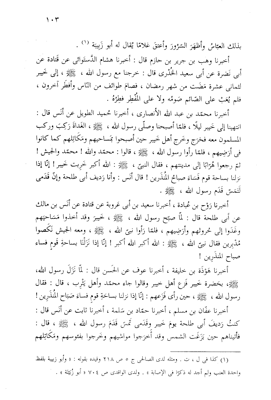 أخبرنا محمّد بن عبد اللَّه الأنصارى، أخبرنا حُميد الطويل عن أنَس قال: انتهينا إلى خَيبر ليلًا، فلمّا أصبحنا وصلّى رسول اللَّه، -صلى اللَّه عليه وسلم-، الغَداةَ رَكِبَ وركب المسلمون معه فخرَج وخَرج أهل خَيبر حين أصبحوا بمَساحيهم ومكَاتِلهم كما كانوا فى أرَضِيهم، فلمّا رأوا رسول اللَّه، -صلى اللَّه عليه وسلم-، قالوا: محمّد واللَّه! محمّد والجيش! ثمّ رجعوا هُرّابًا إلى مدينتهم، فقال النبىّ، -صلى اللَّه عليه وسلم-: اللَّه أكبر خَرِبت خَيبر! إنّا إذا نزلنا بساحة قوم فَسَاءَ صباحُ المُنذَرين! قال أنَس: وأنا رَديف أبى طلحة وإنّ قَدَمى لَتَمَسّ قَدَم رسول اللَّه، -صلى اللَّه عليه وسلم-.