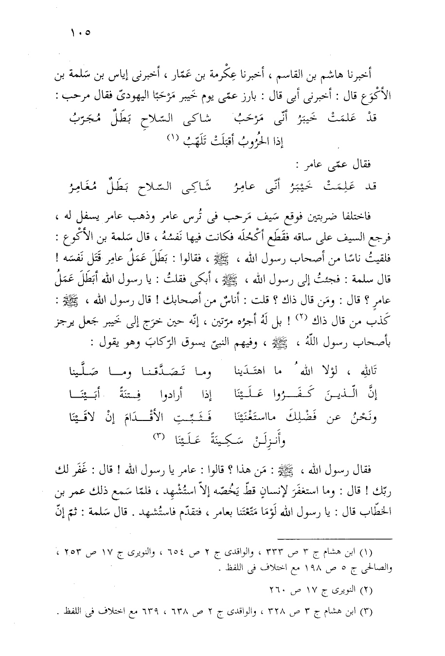 (¬١) ابن هشام ج ٣ ص ٣٣٣، والواقدى ج ٢ ص ٦٥٤، والنويرى ج ١٧ ص ٢٥٣، والصالحى ج ٥ ص ١٩٨ مع اختلاف فى اللفظ.