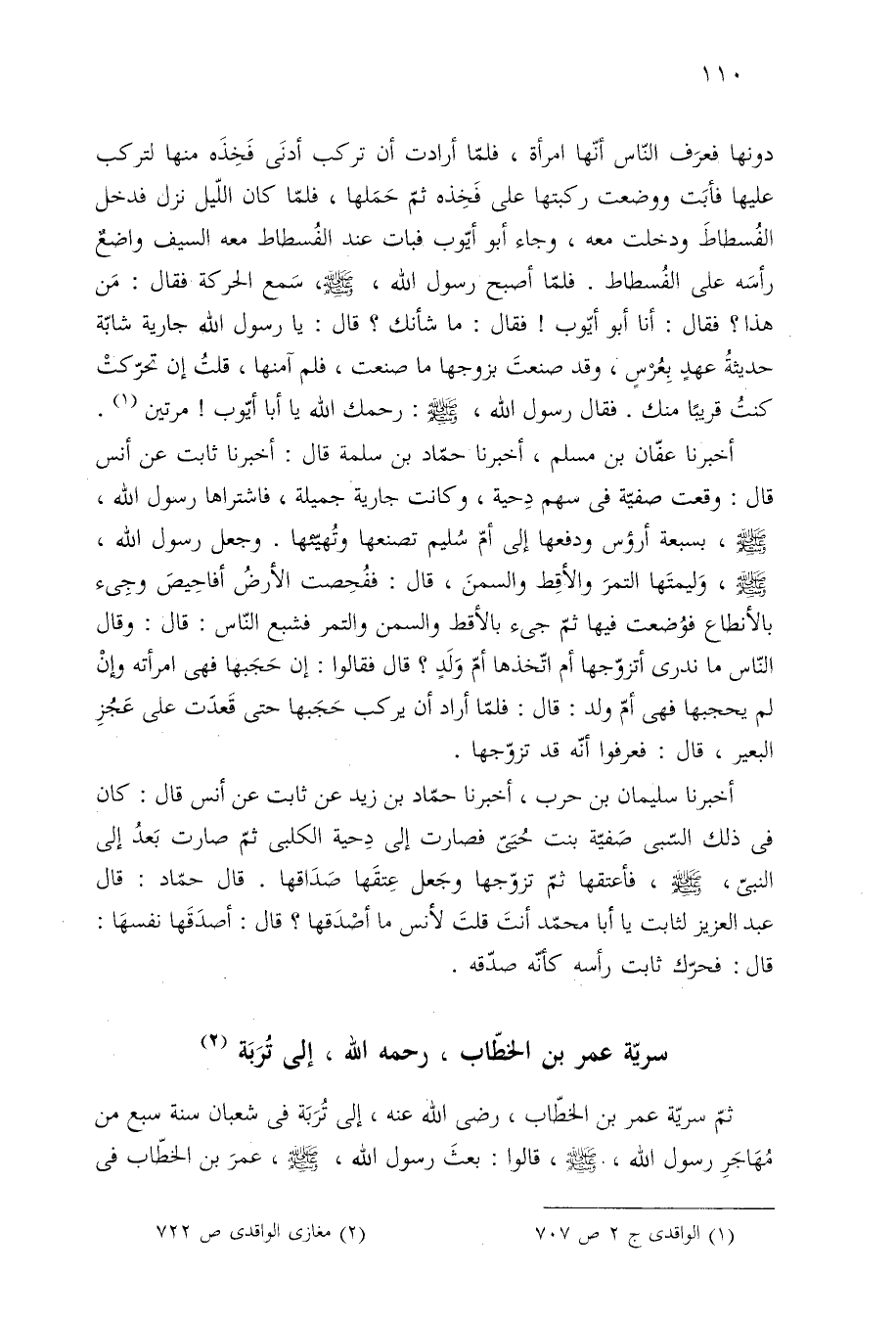 أخبرنا عفّان بن مسلم، أخبرنا حمّاد بن سلمة قال: أخبرنا ثابت عن أنس قال: وقعت صفيّة فى سهم دِحية، وكانت جارية جميلة، فاشتراها رسول اللَّه، -صلى اللَّه عليه وسلم-، بسبعة أرؤس ودفعها إلى أمّ سُليم تصنعها وتُهيّئها. وجعل رسول اللَّه، -صلى اللَّه عليه وسلم-، وَليمتَها التمرَ والأقِط والسمنَ، قال: ففُحِصت الأرضُ أفاحِيصَ وجِئ بالأنطاع فوُضعت فيها ثمّ جئ بالأقط والسمن والتمر فشبع النّاس: قال: وقال النّاس ما ندرى أتزوّجها أم اتّخذها أمّ وَلَدٍ؟ قال فقالوا: إن حَجَبها فهى امرأته وإنْ لم يحجبها فهى أمّ ولد: قال: فلمّا أراد أن يركب حَجَبها حتى قَعدَت على عَجُزِ البعير، قال: فعرفوا أنّه قد تزوّجها.