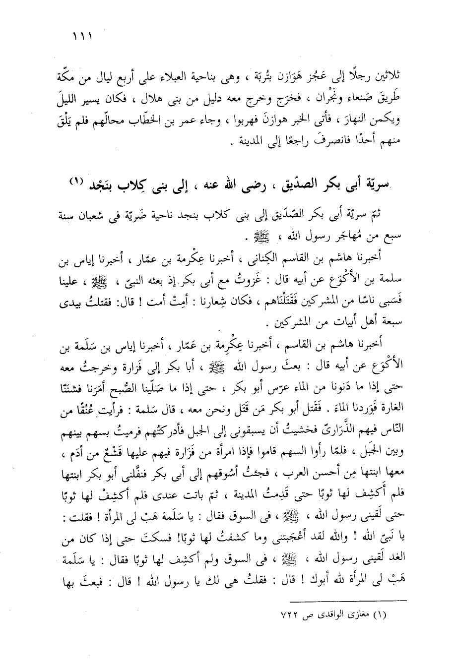 أخبرنا هاشم بن القاسم، أخبرنا عِكْرِمة بن عَمّار، أخبرنا إياس بن سَلَمة بن الأكْوَع عن أبيه قال: بعثَ رسول اللَّه -صلى اللَّه عليه وسلم-، أبا بكر إلى فَزارة وخرجتُ معه حتى إذا ما دَنونا من الماء عرّس أبو بكر، حتى إذا ما صَلّينا الصُّبح أمَرَنا فشنَنّا الغارة فَوَردنا الماءَ. فَقَتل أبو بكر مَن قَتَل ونحن معه، قال سَلمة: فرأيت عُنُقًا من النّاس فيهم الذَّرَارىّ فخشيت أن يسبقونى إلى الجبل فأدركتهم فرميت بسهم بينهم وبين الجبَل، فلمّا رأوا السهم قاموا فإذا امرأة من فَزَارة فيهم عليها قَشْعٌ من أدَم، معها ابنتها مِن أحسن العرب، فجئتُ أسُوقهم إلى أبى بكر فنفَّلنى أبو بكر ابنتها فلم أَكشِف لها ثوبًا حتى قَدِمت المدينة، ثمّ باتت عندى فلم أكشِفْ لها ثوبًا حتى لَقينى رسول اللَّه، -صلى اللَّه عليه وسلم-، فى السوق فقال: يا سَلَمة هَبْ لى المرأة! فقلت: يا نبىّ اللَّه! واللَّه لقد أعْجَبتنى وما كشفتُ لها ثوبًا! فسكتَ حتى إذا كان من الغد لَقينى رسول اللَّه، -صلى اللَّه عليه وسلم-، فى السوق ولم أكشَف لها ثوبًا فقال: يا سَلَمة هَبْ لى المرأة للَّه أبوك! قال: فقلتُ هى لك يا رسول اللَّه! قال: فبعثَ بها