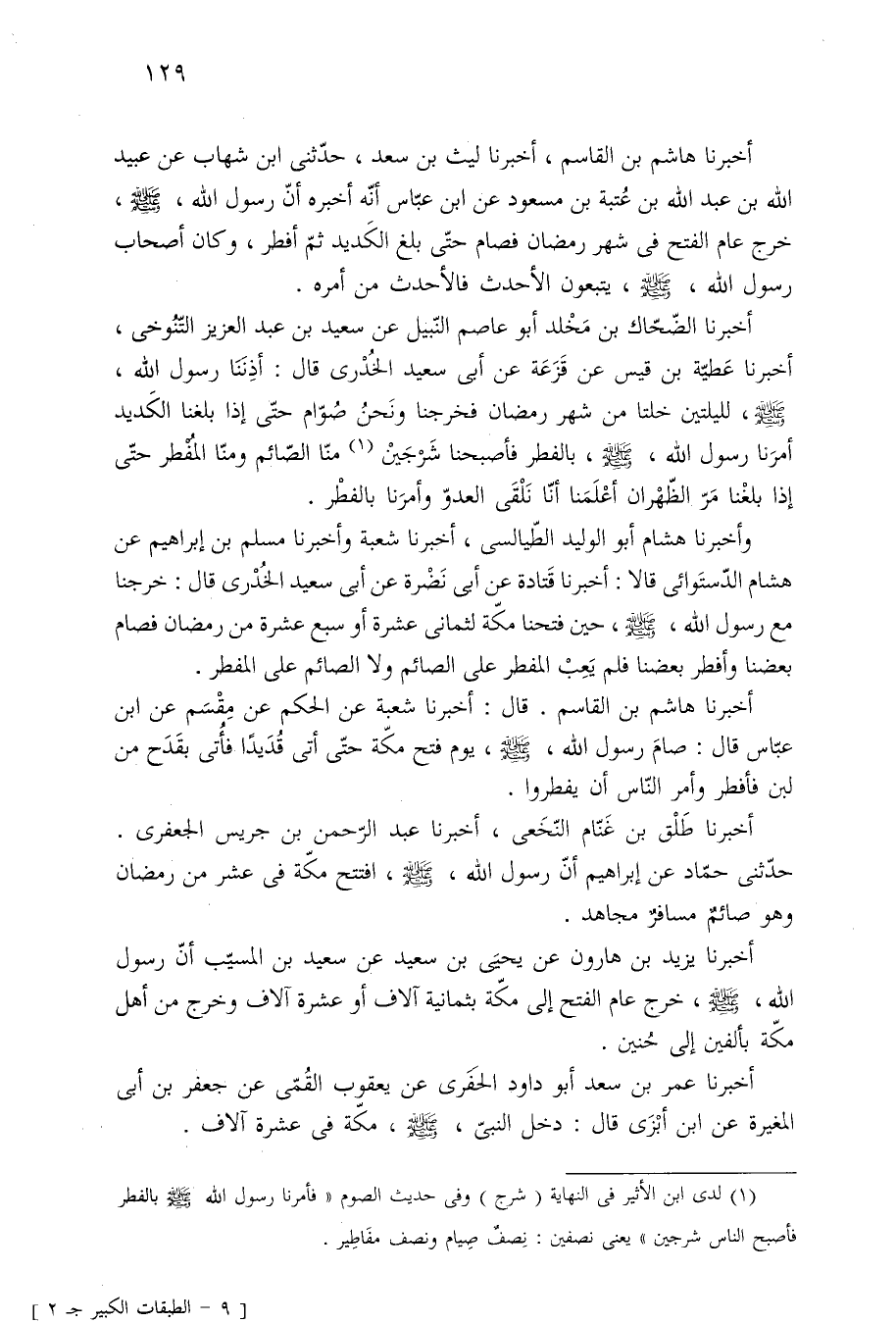 أخبرنا هاشم بن القاسم، أخبرنا ليث بن سعد، حدّثنى ابن شهاب عن عبيد الله بن عبد الله بن عُتبة بن مسعود عن ابن عبّاس أنّه أخبره أنّ رسول الله، - صلى الله عليه وسلم -، خرج عام الفتح في شهر رمضان فصام حتَّى بلغ الكَديد ثمّ أفطر، وكان أصحاب رسول الله، - صلى الله عليه وسلم -، يتبعون الأحدث فالأحدث من أمره.