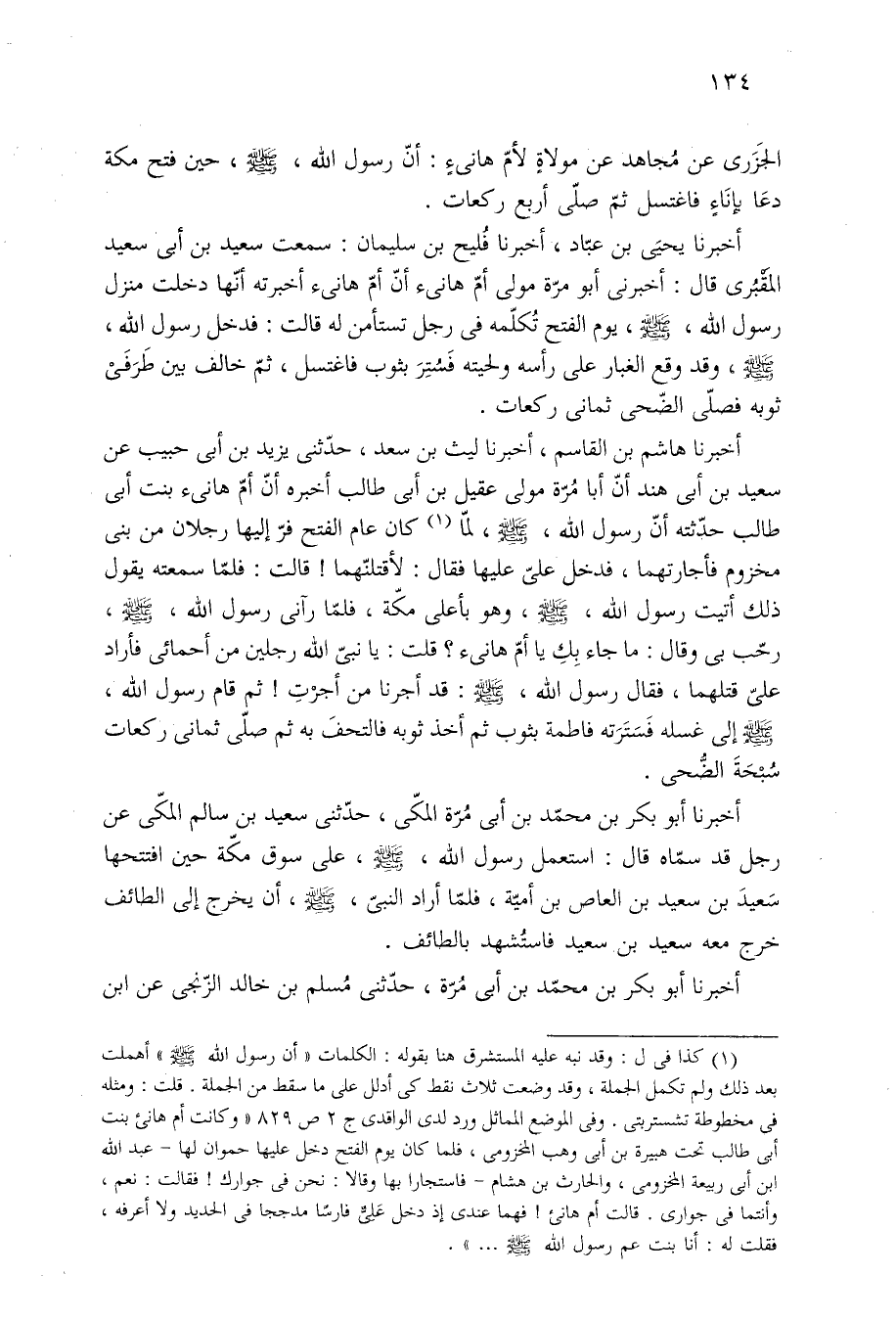 أخبرنا يحيَى بن عبّاد، أخبرنا فُليح بن سليمان: سمعت سعيد بن أبي سعيد المقبُرى قال: أخبرني أبو مرّة مولى أمّ هانئ أنّ أمّ هانئ أخبرته أنّها دخلت منزل رسول الله، - صلى الله عليه وسلم -، يوم الفتح تُكلّمه في رجل تستأمن له قالت: فدخل رسول الله، - صلى الله عليه وسلم -، وقد وقع الغبار - على رأسه ولحيته فَسُتِرَ بثوب فاغتسل، ثمّ خالف بين طَرَفَيْ ثوبه فصلّى الضّحى ثمانى ركعات.