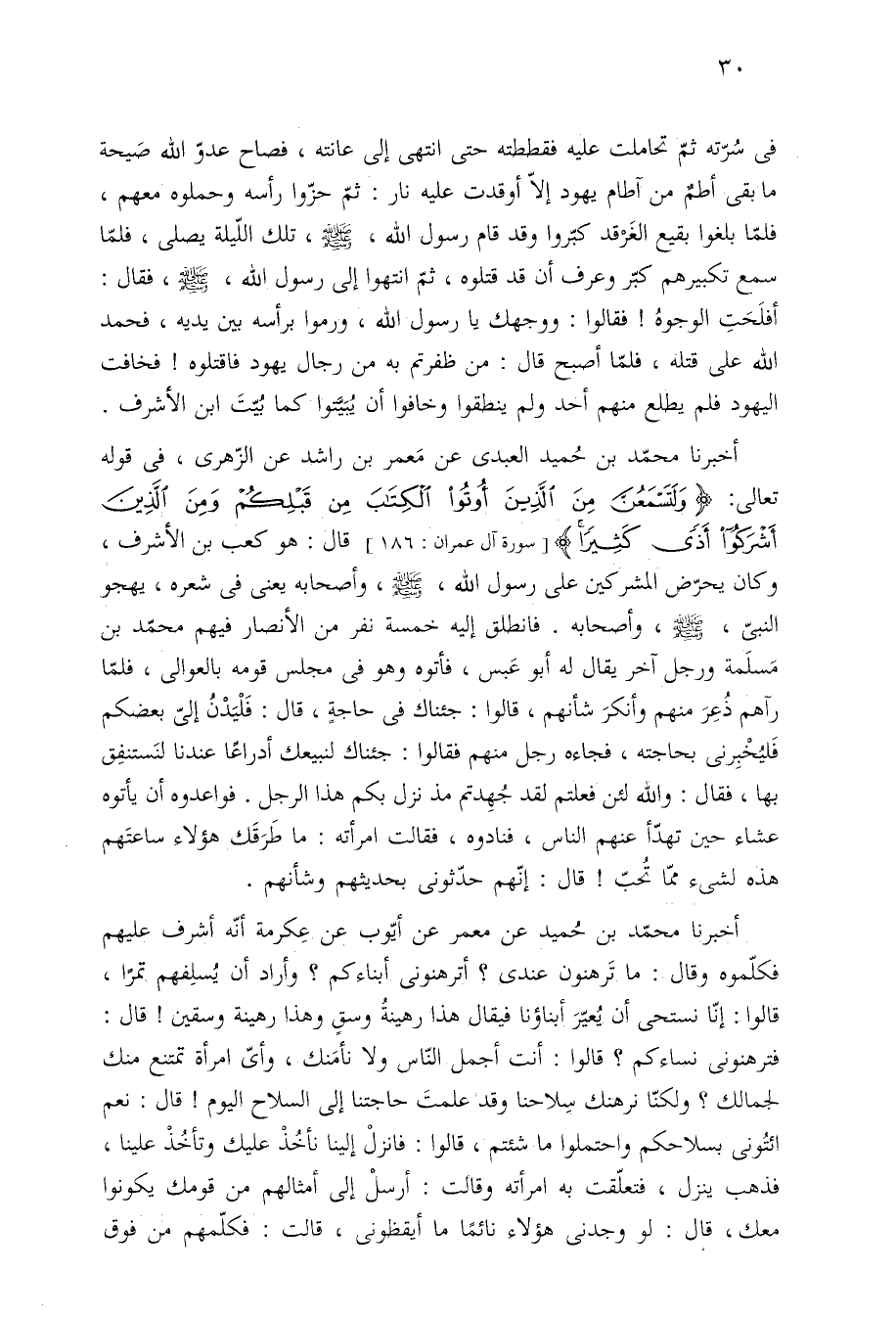أخبرنا محمّد بن حُميد العبدى عن مَعمر بن راشد عن الزّهرى، فى قوله تعالى: {وَلَتَسْمَعُنَّ مِنَ الَّذِينَ أُوتُوا الْكِتَابَ مِنْ قَبْلِكُمْ وَمِنَ الَّذِينَ أَشْرَكُوا أَذًى كَثِيرًا} [سورة آل عمران: ١٨٦]، قال: هو كعب بن الأشرف، وكان يحرّض المشركين على رسول اللَّه، -صلى اللَّه عليه وسلم-، وأصحابه يعنى فى شعره، يهجو النبىّ، -صلى اللَّه عليه وسلم-، وأصحابه. فانطلق إليه خمسة نفر من الأنصار فيهم محمّد بن مَسلَمة ورجل آخر يقال له أبو عَبس، فأتوه وهو فى مجلس قومه بالعوالى، فلمّا رآهم ذُعِرَ منهم وأنكرَ شأنهم، قالوا: جئناك فى حاجةِ، قال: فَلْيَدْنُ إلىّ بعضكم فَليُخْبِرنى بحاجته، فجاءه رجل منهم فقالوا: جئناك لنبيعك أدراعًا عندنا لنَستنفِق بها، فقال: واللَّه لئن فعلتم لقد جُهِدتم مذ نزل بكم هذا الرجل. فواعدوه أن يأتوه عشاء حين تهدّأ عنهم الناس، فنادوه، فقال امرأته: ما طَرَقَك هؤلاء ساعتَهم هذه لشئ ممّا تُحبّ! قال: إنّهم حدّثونى بحديثهم وشأنهم.