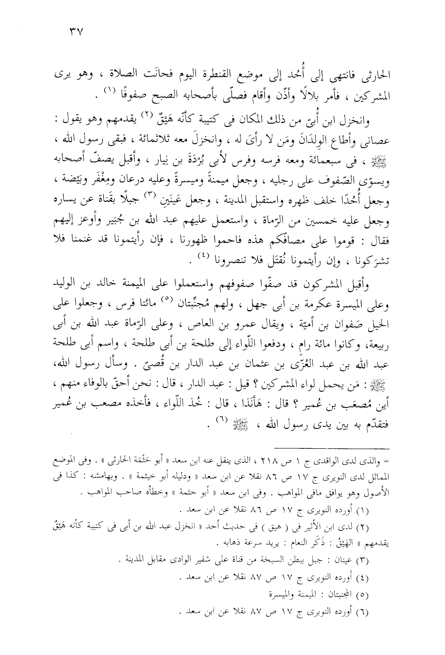 الحارثى فانتهى إلى أُحُد إلى موضع القنطرة اليوم فحانَت الصلاة، وهو يرى المشركين، فأمر بلالًا وأذّن وأقام فصلّى بأصحابه الصبح صفوفًا (¬١).