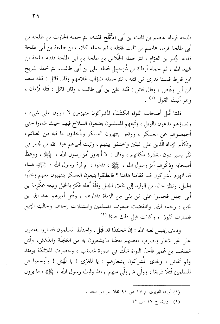 ونادى إبليس لعنه اللَّه: إنّ مُحمّدًا قد قُتِل. واختلط المسلمون فصاروا يقتتلون على غير شعار ويضرب بعضهم بعضًا ما يشعرون به من العَجَلَة والدّهَش، وقُتل مُصعَب بن عُمير فأخذ اللواءَ مَلَكٌ فى صورة مُصعَب، وحضرت الملائكة يومئذ ولم تُقاتل، ونادى المُشركون بِشعارهم: يا للعُزّى! يا لَهُبَل! وأوجعوا فى المسلمين قَتلًا ذريعًا، وولّى منهم ولّى منهم يومئذ وثَبتَ رسول اللَّه، -صلى اللَّه عليه وسلم-، ما يزول