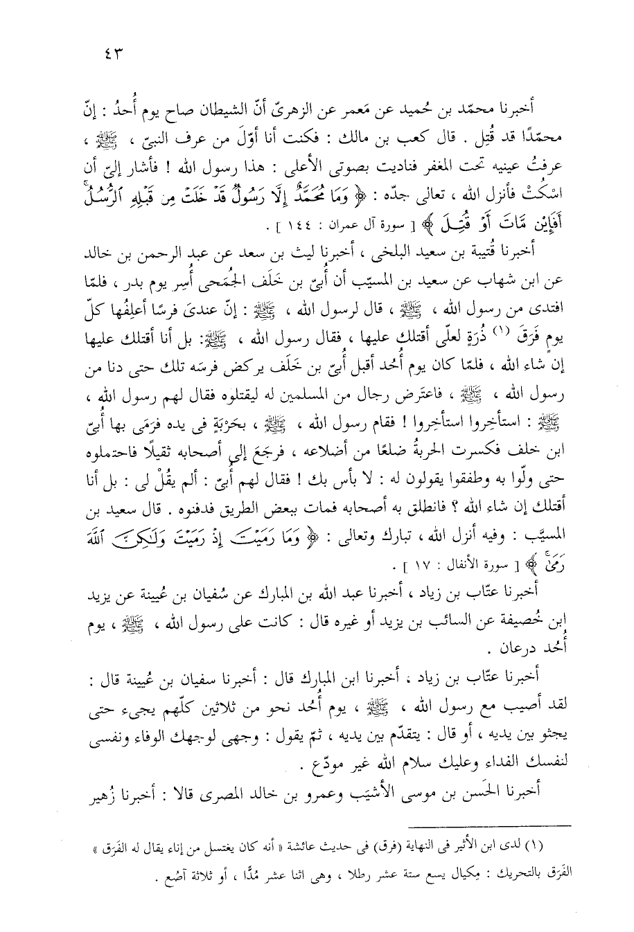 أخبرنا محمّد بن حُميد عن مَعمر عن الزهرى أن الشيطان صاح يوم أُحُد: إنّ محمّدًا قد قُتِل. قال كعب بن مالك: فكنت أنا أوّل من عرف النبىّ، -صلى اللَّه عليه وسلم-، عرفتُ عينيه تحت المغفر فناديت بصوتى الأعلى: هذا رسول اللَّه! فأشار إلىّ أن اشكُتْ فأنزل اللَّه تعالى جدّه: {وَمَا مُحَمَّدٌ إِلَّا رَسُولٌ قَدْ خَلَتْ مِنْ قَبْلِهِ الرُّسُلُ أَفَإِنْ مَاتَ أَوْ قُتِلَ} [سورة آل عمران: ١٤٤].