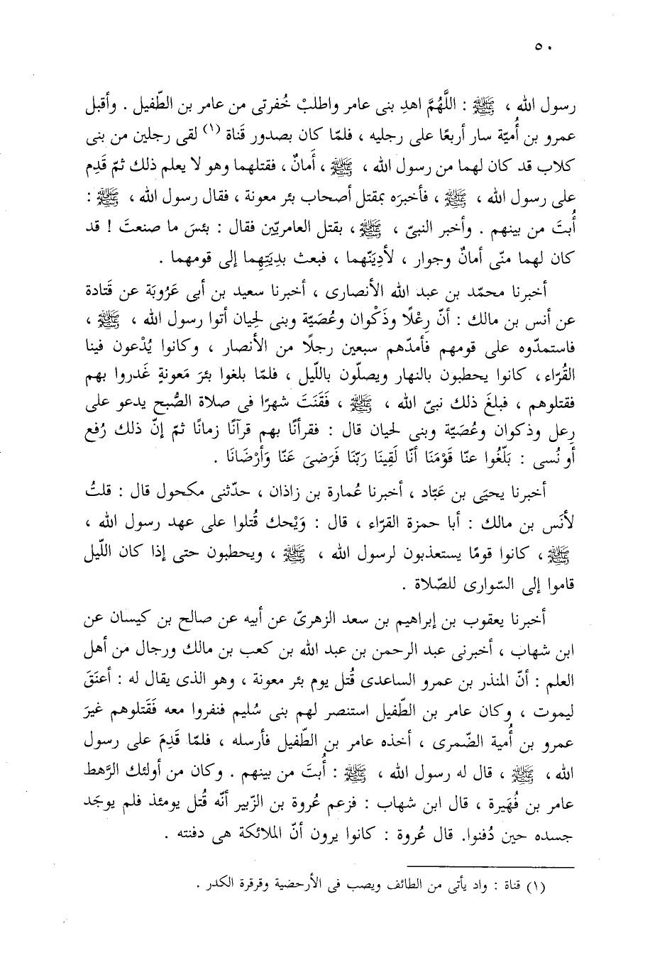 أخبرنا محمّد بن عبد اللَّه الأنصارى، أخبرنا سعيد بن أبى عَرُوبَة عن قَتادة عن أنس بن مالك: أنّ رِعْلًا وذَكْوان وعُصَيّة وبنى لِحيان أتوا رسول اللَّه، -صلى اللَّه عليه وسلم-، فاستمدّوه على قومهم فأمدّهم سبعين رجلًا من الأنصار، وكانوا يُدْعون فينا القُرّاء، كانوا يحطبون بالنهار ويصلّون باللّيل، فلمّا بلغوا بئرَ مَعونةٍ غَدروا بهم فقتلوهم، فبلغَ ذلك نبىّ اللَّه، -صلى اللَّه عليه وسلم-، فَقَنَتَ شهرًا فى صلاة الصُّبح يدعو على رِعل وذكوان وعُصَيّة وبنى لحيان قال: فقرأنا بهم قرآنًا زمانًا ثمّ إنّ ذلك رُفع أو نُسى: بَلّغُوا عنّا قَوْمَنَا أنّا لَقِينَا رَبّنَا فَرَضىَ عَنّا وَأرْضَانَا.