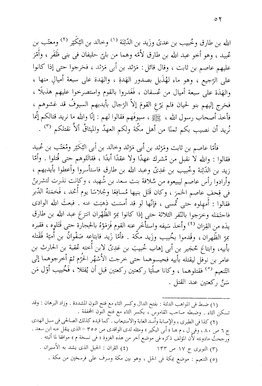 فأمّا عاصم بن ثابت ومَرْثد بن أبى مَرْثد وخالد بن أبى البُكَيْر ومُعَتّب بن عُبيد فقالوا: واللَّه لا نقبل من مُشرك عهدًا ولا عقدًا أبدًا، فقاتَلوهم حتى قُتلوا. وأمّا زيد بن الدّثِنة وخُبيب بن عَدِىّ وعبد اللَّه بن طارق فاستأسروا وأعطوا بأيديهم، وأرادوا رأس عاصم ليبيعوه من سُلافة بنت سعد بن شُهيد، وكانت نذرت لتشربنّ فى قِحف عاصم الخمرَ، وكان قَتَل بنيها مُسافِعًا وجُلاسًا يوم أُحُد، فَحَمَتهُ الدّبر فقالوا: أَمهِلوه حتى تُمسى، فإنّها لو قد أمسَت ذهبَت عنه. فبعثَ اللَّه الوادى فاحتَمَله وخرَجوا بالنّفر الثلاثة حتى إذا كانوا بمرّ الظَّهْران انتزعَ عبد اللَّه بن طارق يدَه من القِرَان (¬٤) وأخذ سيفه واستأخَر عنه القوم فَرَمَوْهُ بالحِجارة حتى قَتَلوه، فقبره بمرّ الظّهران، وقَدموا بخُبيب وزَيد مكّة. فأمّا زَيد فابتاعه صَفْوان بن أُميّة فَقَتله بأبيه، وابتاعَ حُجَير بن أبى إهاب خُبيبَ بن عَدِىّ لابن أُخته عُقبة بن الحارث بن عامر بن نوفل ليقتله بأبيه فحبسوهما حتى خرجت الأشهُر الحرُم ثمّ أخرجوهما إلى التّنعيم (¬٥) فقتلوهما، وكانا صلّيَا ركعتين ركعتن قبل أن يُقتَلا، فَخُبيب أوّل مَن سَنَّ ركعتين عند القتل.