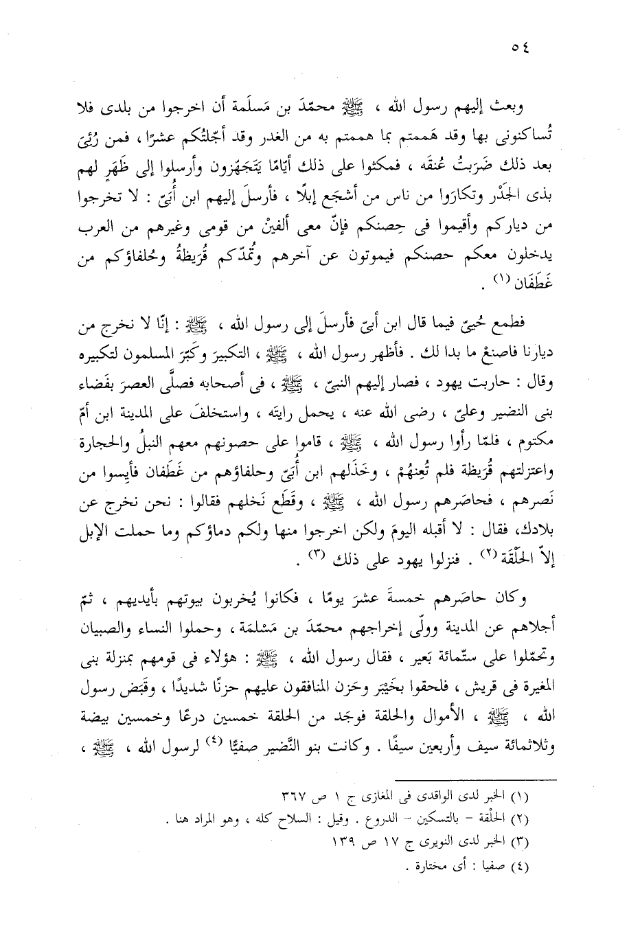 وكان حاصَرهم خمسةَ عشرَ يومًا، فكانوا يُخربون بيوتهم بأيديهم، ثمّ أجلاهم عن المدينة وولّى إخراجهم محمّدَ بن مَسْلمَة، وحملوا النساء والصبيان وتحمّلوا على ستّمائة بَعير، فقال رسول اللَّه، -صلى اللَّه عليه وسلم-: هؤلاء فى قومهم بمنزلة بنى المغيرة فى قريش، فلحقوا بخَيْبَر وحَزن المنافقون عليهم حزنًا شديدًا، وقَبَض رسول اللَّه، -صلى اللَّه عليه وسلم-، الأموال والحلقة فوجَد من الحلقة خمسين درعًا وخمسين بيضة وثلاثمائة سيف وأربعين سيفًا. وكانت بنو النَّضير صفيًّا (¬٤) لرسول اللَّه، -صلى اللَّه عليه وسلم-،