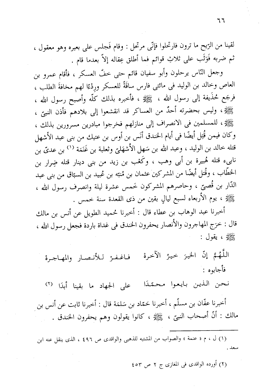 أخبرنا عفّان بن مسلّم، أخبرنا حَمّاد بن سَلمَة قال: أخبرنا ثابت عن أنس بن مالك: أنّ أصحاب النبىّ، -صلى اللَّه عليه وسلم-، كانوا يقولون وهم يحفرون الخندق.