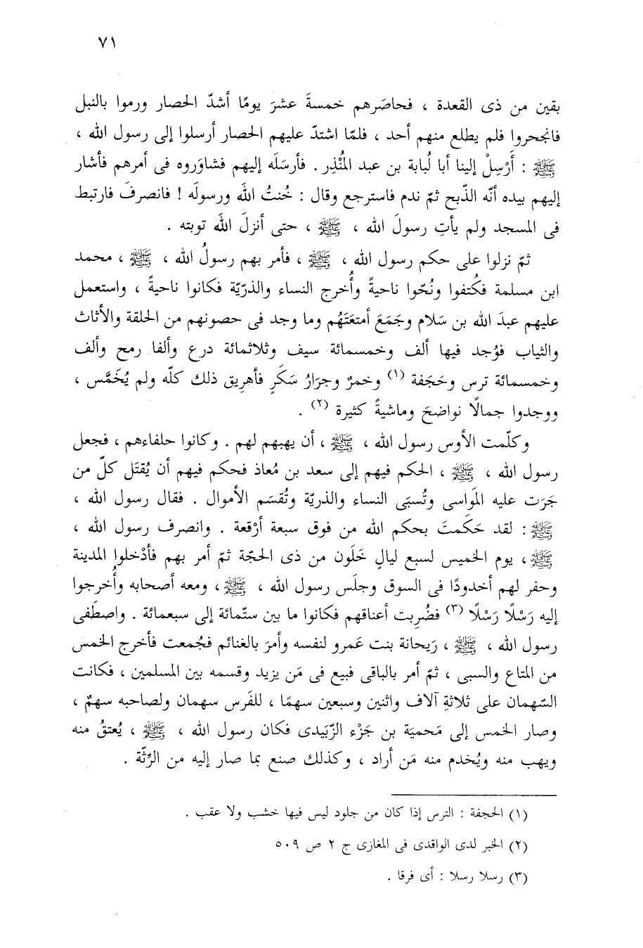 وكلّمت الأوس رسول اللَّه، -صلى اللَّه عليه وسلم-، أن يهبهم لهم. وكانوا حلفاءهم، فجعل رسول اللَّه، -صلى اللَّه عليه وسلم-، الحكم فيهم إلى سعد بن مُعاذ فحكم فيهم أن يُقتَل كلّ من جَرَت عليه المَواسى وتُسبَى النساء والذريّة وتُقسَم الأموال. فقال رسول اللَّه، -صلى اللَّه عليه وسلم-: لقد حَكَمتَ بحكم اللَّه من فوق سبعة أرْقعة. وانصرف رسول اللَّه، -صلى اللَّه عليه وسلم-، يوم الخميس لسبع ليالٍ خَلَون من ذى الحجّه ثمّ أمر بهم فأدْخلوا المدينة وحفر لهم أخدودًا فى السوق وجلَس رسول اللَّه، -صلى اللَّه عليه وسلم-، ومعه أصحابه وأُخرجوا إليه رَسْلًا رَسْلًا (¬٣) فضُرِبت أعناقهم فكانوا ما بين ستّمائة إلى سبعمائة. وأصطَفى رسول اللَّه، -صلى اللَّه عليه وسلم-، رَيحانة بنت عَمرو لنفسه وأمرَ بالغنائم فجُمعت فأخرج الخمس من المتاع والسبى، ثمّ أمر بالباقى فبيع فى مَن يزيد وقسمه بين المسلمين، فكانت السّهمان على ثلاثةِ آلاف واثنين وسبعين سهمًا، للفَرس سهمان ولصاحبه سهمٌ، وصار الخمس إلى مَحميَة بن جَزْء الزّبَيدى فكاان رسول اللَّه، -صلى اللَّه عليه وسلم-، يُعتقُ منه ويهب منه ويُخدم منه مَن أراد، وكذلك صنع بما صار إليه من الرِّثّة.