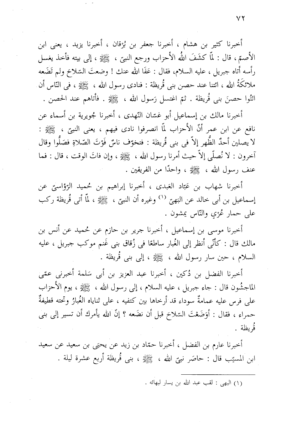 أخبرنا كثير بن هشام، أخبرنا جعفر بن بُرْقان، أخبرنا يزيد، يعنى ابن الأصمّ، قال: لمّا كشَفَ اللَّهُ الأحزاب ورجع النبىّ، -صلى اللَّه عليه وسلم-، إلى بيته فأخذ يغسل رأسه أتاه جبريل، عليه السلام، فقال: عَفَا اللَّه عنك! وضعتَ السّلاحَ ولم تَضَعه ملائكَةُ اللَّه، ائتنا عند حصن بنى قُريظه: فنادى رسول اللَّه، -صلى اللَّه عليه وسلم-، فى النّاس أن ائتُوا حصنَ بنى قُريظة. ثمّ اغتسل رَسول اللَّه، -صلى اللَّه عليه وسلم-. فأتاهم عند الحصن.