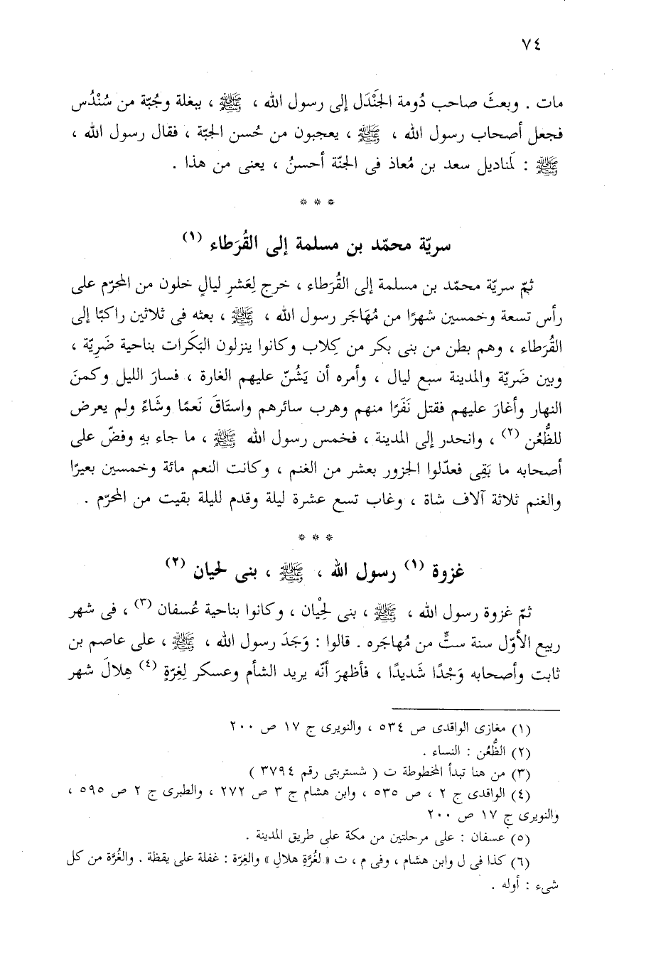 ثمّ سريّة محمّد بن مسلمة إلى القُرَطاء، خرج لِعَشرِ ليالٍ خلون من المحرّم على رأس تسعة وخمسين شهرًا من مُهَاجَر رسول اللَّه -صلى اللَّه عليه وسلم-، بعثه فى ثلاثين راكبًا إلى القُرَطاء، وهم بطن من بنى بكر من كِلاب وكانوا ينزلون البَكَرات بناحية ضَرِيّة، وبين ضَريّة والمدينة سبع ليال، وأمره أن يَشُنّ عليهم الغارة، فسارَ الليل وكمنَ النهار وأغارَ عليهم فقتل نَفَرًا منهم وهرب سائرهم واستَاقَ نَعمًا وشَاءً ولم يعرض للظُّعُن (¬٢)، وانحدر إلى المدينة، فخمس رسول اللَّه -صلى اللَّه عليه وسلم-، ما جاء بهِ وفضّ على أصحابه ما بَقِى فعدّلوا الجزور بعشر من الغنم، وكانت النعم مائة وخمسين بعيرًا والغنم ثلاثة آلاف شاة، وغاب تسع عشرة ليلة وقدم لليلة بقيت من المحرّم.