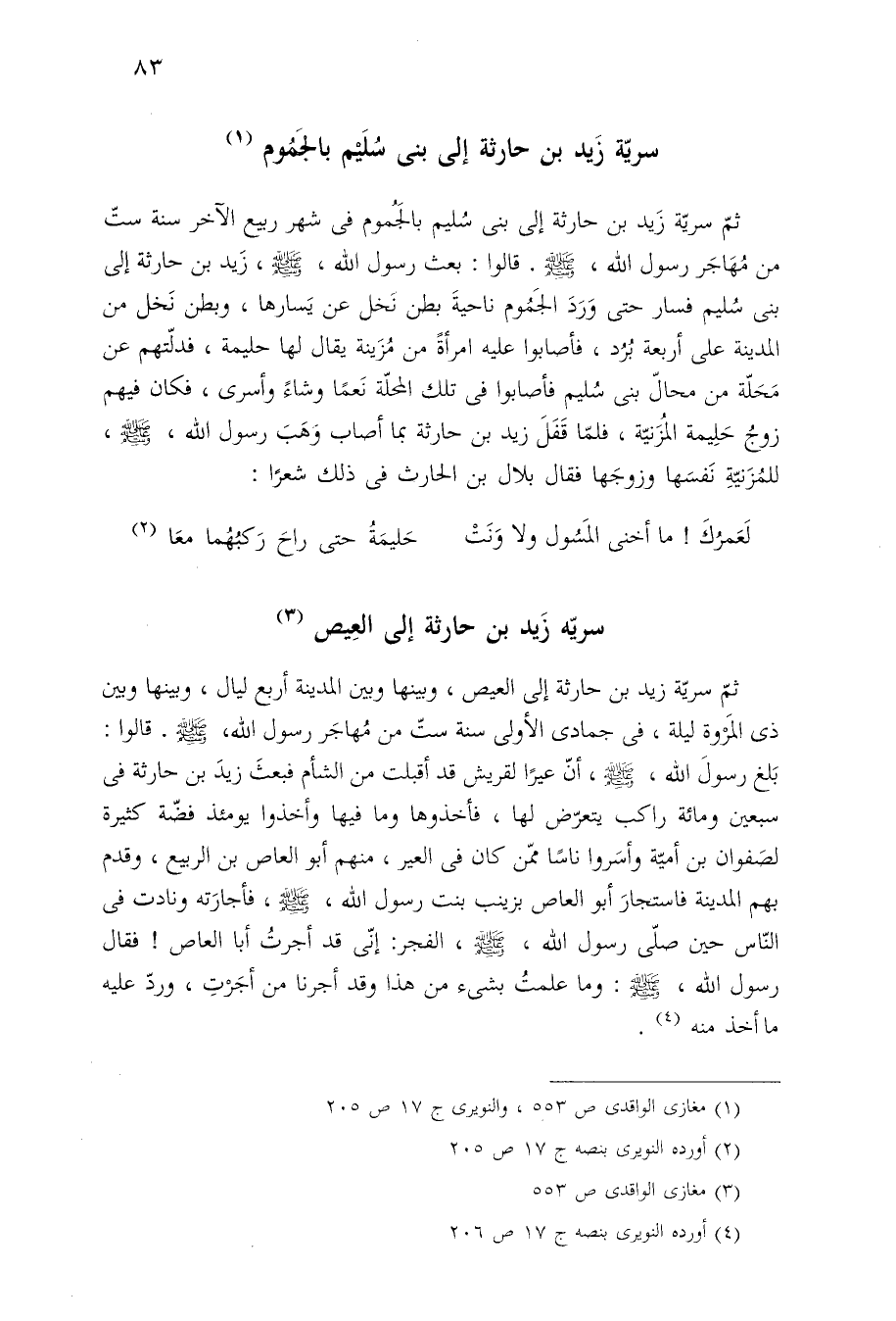 ثمّ سريّة زَيد بن حارثة إلى بنى سُليم بالجَمُوم فى شهر ربيع الآخر سنة ستّ من مُهَاجَر رسول اللَّه، -صلى اللَّه عليه وسلم-. قالوا: بعث رسول اللَّه، -صلى اللَّه عليه وسلم-، زَيد بن حارتة إلى بنى سُليم فسار حتى وَرَدَ الجَمُوم ناحيةَ بطن نَخل عن يَسارها، وبطن نَخل من المدينة على أربعة بُرُد، فأصابوا عليه امرأةً من مُزَينة يقال لها حليمة، فدلّتهم عن مَحَلّة من محالّ بنى سُليم فأصابوا فى تلك المحلّة نَعمًا وشاءً وأسرى، فكان فيهم زوجُ حَلِيمة المُزَنيّة، فلمّا قَفَلَ زيد بن حارثة بما أصاب وَهَبَ رسول اللَّه، -صلى اللَّه عليه وسلم-، للمُزَنيّةِ نَفسَها وزوجَها فقال بلال بن الحارث فى ذلك شعرًا: