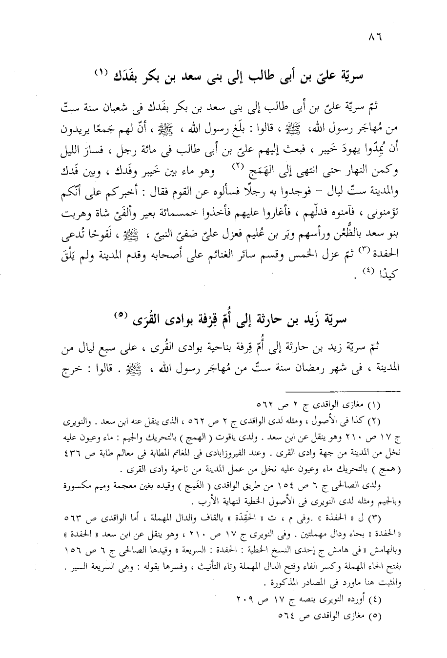 ثمّ سريّة علىّ بن أبى طالب إلى بنى سعد بن بكر بفَدك فى شعبان سنة ستّ من مُهاجَر رسول اللَّه، -صلى اللَّه عليه وسلم-، قالوا: بلَغ رسول اللَّه، -صلى اللَّه عليه وسلم-، أنّ لهم جَمعًا يريدون أن يُمِدّوا يهودَ خَيبر، فبعث إليهم علىّ بن أبى طالب فى مائة رجل، فسارَ الليل وكمن النهار حتى انتهى إلى الهَمَج (¬٢) -وهو ماء بين خَيبر وفَدك، وبين فَدك والمدينة ستّ ليال- فوجدوا به رجلًا فسألوه عن القوم فقال: أخبركم على أنّكم تؤمنونى، فآمنوه فدلّهم، فأغاروا عليهم فأخذوا خمسمائة بعير وألفَىْ شاة وهربت بنو سعد بالظُّعُن ورأسهم وبَر بن عُليم فعزل علىّ صَفىّ النبىّ، -صلى اللَّه عليه وسلم-، لَقوحًا تُدعى الحفدة (¬٣) ثمّ عزل الخمس وقسم سائر الغنائم على أصحابه وقدم المدينة ولم يَلْقَ كيدًا (¬٤).