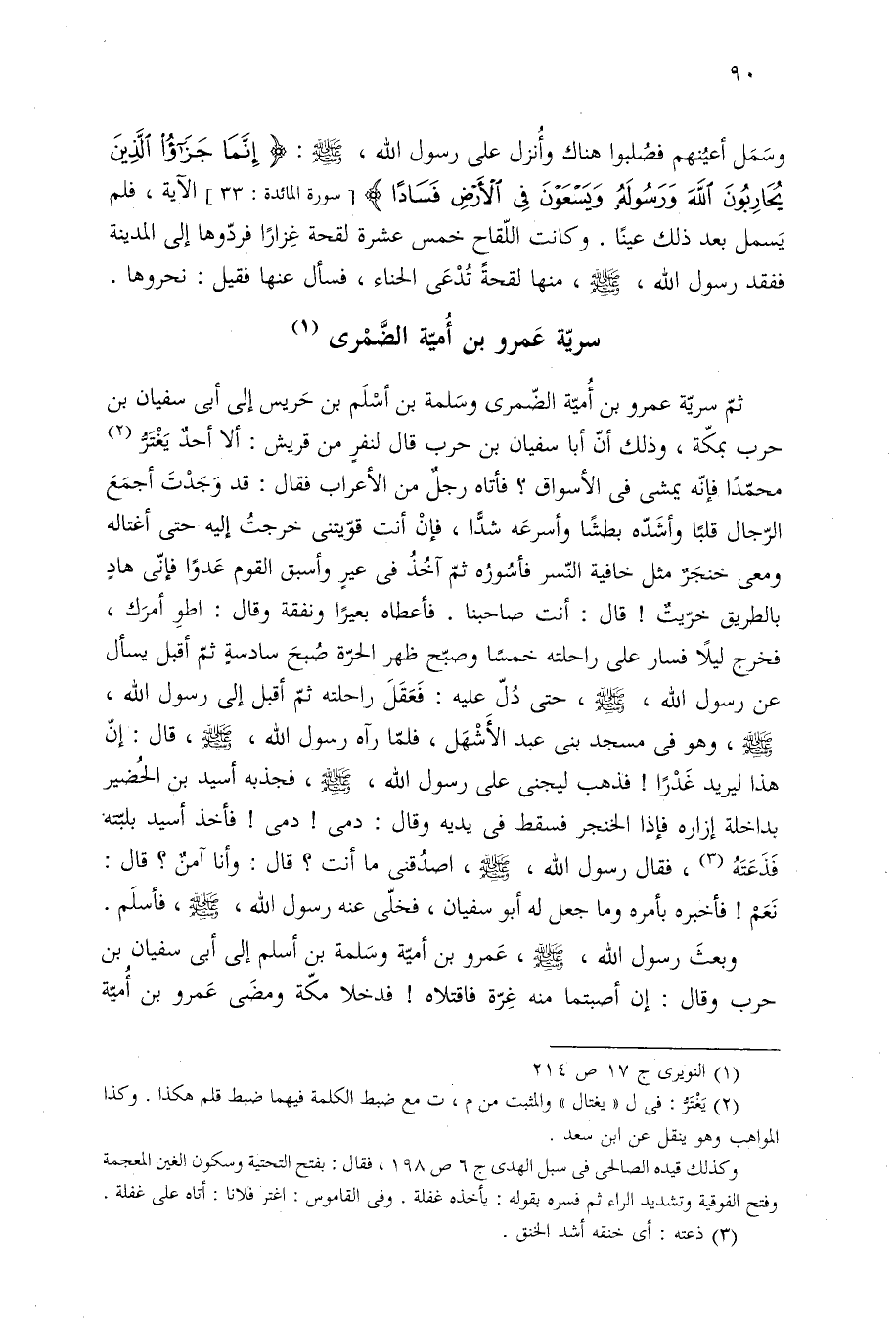 ثمّ سريّة عمرو بن أُميّة الضّمرى وسَلمة بن أسْلَم بن حَريس إلى أبى سفيان بن حرب بمكّة، وذلك أنّ أبا سفيان بن حرب قال لنفرٍ من قريش: ألا أحدٌ يَغْتَرُّ (¬٢) محمّدًا فإنّه يمشى فى الأسواق؟ فأتاه رجلٌ من الأعراب فقال: قد وَجَدْتَ أجمَعَ الرّجال قلبًا وأشَدّه بطشًا وأسرعَه شدًّا، فإنْ أنت قوّيتنى خرجتُ إليه حتى أغتاله ومعى خنجَرٌ مثل خافية النّسر فأسُورُه ثمّ آخُذُ فى عيرٍ وأسبق القوم عَدوًا فإنّى هادٍ بالطريق خرّيتٌ! قال: أنت صاحبنا. فأعطاه بعيرًا ونفقة وقال: اطوِ أمرَك، فخرج ليلًا فسار على راحلته خمسًا وصبح ظهر الحرّة صُبحَ سادسةٍ ثمّ أقبل يسأل عن رسول اللَّه، -صلى اللَّه عليه وسلم-، حتى دُلّ عليه: فَعَقَلَ راحلته ثمّ أقبل إلى رسول اللَّه، -صلى اللَّه عليه وسلم-، وهو فى مسجد بنى عبد الأَشْهَل، فلمّا رآه رسول اللَّه، -صلى اللَّه عليه وسلم-، قال: إنّ هذا ليريد غَدْرًا! فذهب ليجنى على رسول اللَّه، -صلى اللَّه عليه وسلم-، فجذبه أسيد بن الحُضير بداخلة إزاره فإذا الخنجر فسقط فى يديه وقال: دمى! دمى! فأخذ أسيد بلبّته فَذَعَتَهُ (¬٣)، فقال رسول اللَّه، -صلى اللَّه عليه وسلم-، اصدُقنى ما أنت؟ قال: وأنا آمنٌ؟ قال: نَعَمْ! فأخبره بأمره وما جعل له أبو سفيان، فخلّى عنه رسول اللَّه، -صلى اللَّه عليه وسلم-، فأسلَم.