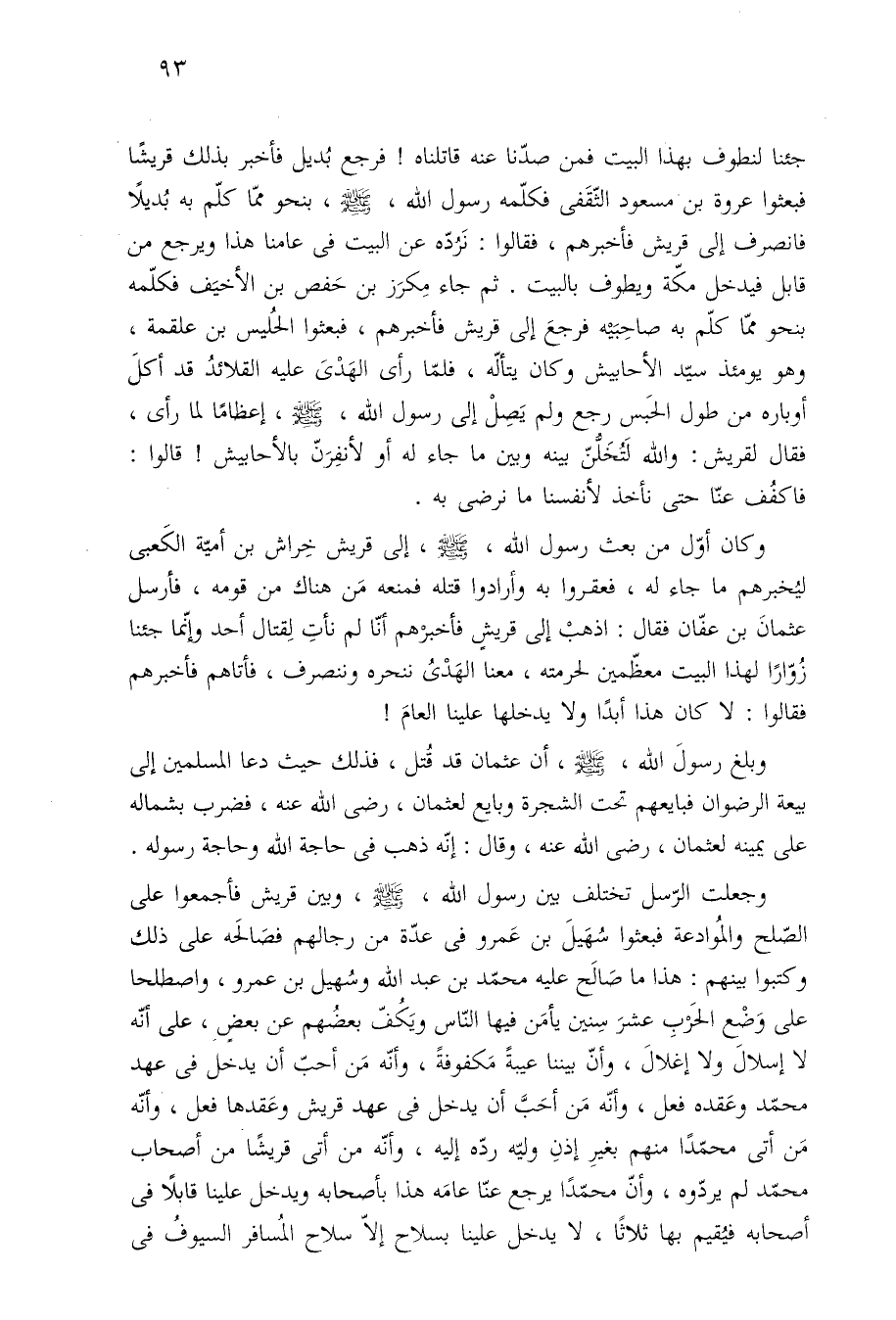 جئنا لنطوف بهذا البيت فمن صدّنا عنه قاتلناه! فرجع بُديل فأخبر بذللث قريشًا فبعثوا عروة بن مسعود الثّقَفى فكلّمه رسول اللَّه، -صلى اللَّه عليه وسلم-، بنحو ممّا كلّم به بُديلًا فانصرف إلى قريش فأخبرهم، فقالوا: نَرُدّه عن البيت فى عامنا هذا ويرجع من قابل فيدخل مكّة ويطوف بالبيت. ثم جاء مِكرَز بن حَفص بن الأخيَف فكلّمه بنحو ممّا كلّم به صاحِبَيْه فرجعَ إلى قريش فأخبرهم، فبعثوا الحُليس بن علقمة، وهو يومئذ سيّد الأحابيش وكان يتألّه، فلمّا رأى الهَدْىَ عليه القلائدُ قد أكلَ أوباره من طول الحَبص رجع ولم يَصِلْ إلى رسول اللَّه، -صلى اللَّه عليه وسلم-، إعظامًا لما رأى، فقال لقريش: واللَّه لَتُخَلُّنّ بينه وبين ما جاء له أو لأنفِرَنّ بالأحابيش! قالوا: فاكفُف عنّا حتى نأخذ لأنفسنا ما نرضى به.