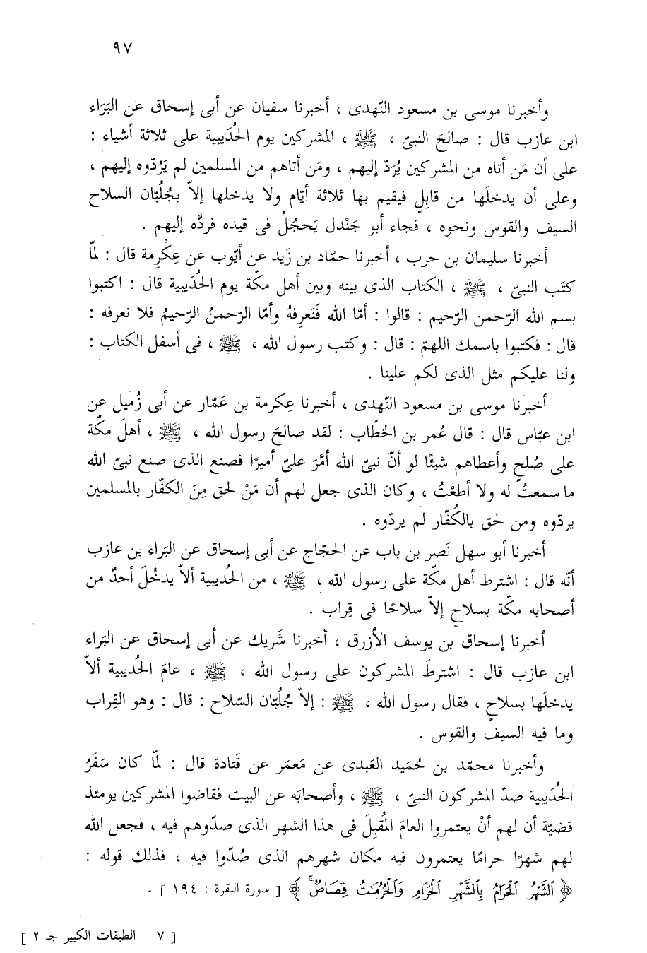 أخبرنا سليمان بن حرب، أخبرنا حمّاد بن زَيد عن أيّوب عن عِكْرِمة قال: لمّا كتَب النبىّ، -صلى اللَّه عليه وسلم-، الكتاب الذى بينه وبين أهل مكَة يوم الحُدَيبية قال: اكتبوا بسم اللَّه الرّحمن الرّحيم: قالوا: أمّا اللَّه فَنَعرِفهُ وأمّا الرّحمنُ الرّحيمُ فلا نعرفه: قال: فكتبوا باسمك اللهمّ: قال: وكتب رسول اللَّه، -صلى اللَّه عليه وسلم-، فى أسفل الكتاب: ولنا عليكم مثل الذى لكم علينا.