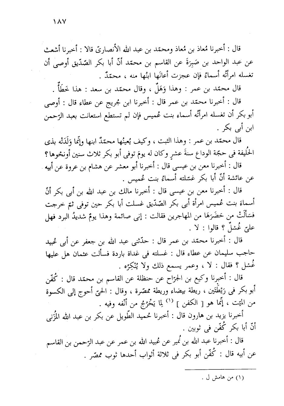 قال: أخبرنا عبد الله بن نُمير عن عُبيد الله بن عمر عن عبد الرّحمن بن القاسم عن أبيه قال: كُفّن أبو بكر في ثلاثة أثواب أحدها ثوب ممصّر.