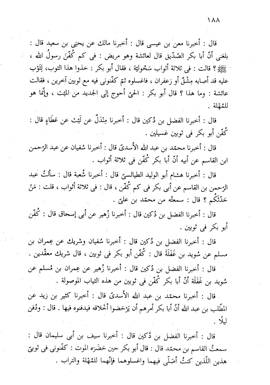 قال: أخبرنا محمّد بن عبد الله الأسديّ قال: أخبرنا سُفيان عن عبد الرّحمن بن القاسم عن أبيه أنّ أبا بكر كُفّن في ثلاثة أثواب.
