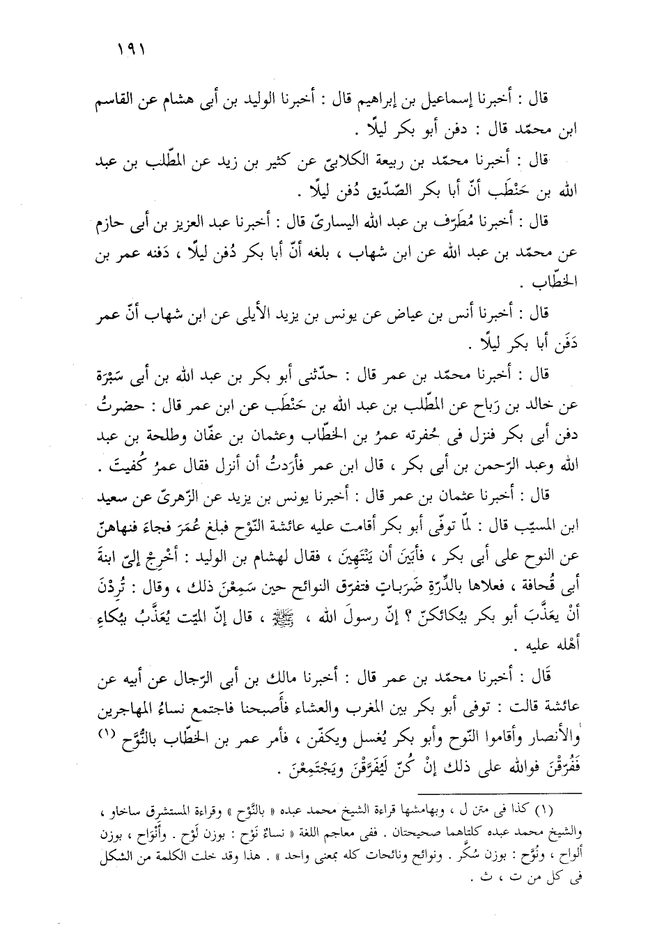 قال: أخبرنا عثمان بن عمر قال: أخبرنا يونس بن يزيد عن الزّهريّ عن سعيد بن المسيّب قال: لمّا توفّى أبو بكر أقامت عليه عائشة النّوْح فبلغ عُمَرَ فجاءَ فنهاهنّ عن النوح على أبى بكر، فأبَينَ أن يَنْتَهِينَ، فقال لهشام بن الوليد: أخْرِجْ إليّ ابنةَ أبى قُحافة، فعلاها بالدِّرّةِ ضَرَباتٍ فتفرّق النوائح حين سَمِعْنَ ذلك، وقال: تُرِدْنَ أنْ يعَذَّبَ أبو بكر ببُكائكنّ؟ إنّ رسولَ الله، - صلى الله عليه وسلم -، قال إنّ الميّت يُعَذَّبُ ببُكاءِ أهْله عليه.